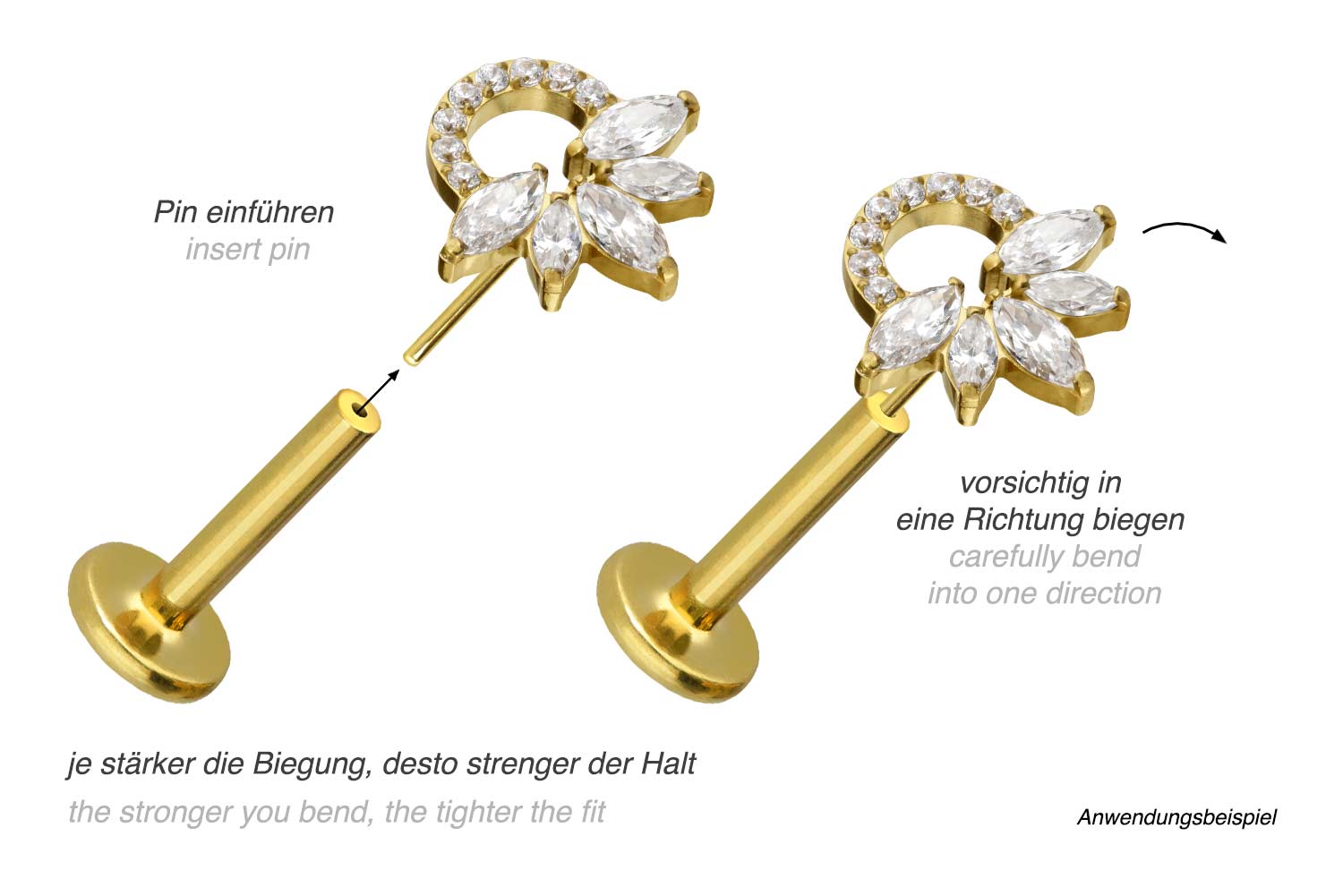 or 1.2 mm and is available with the bar lengths listed below. Due to the push fit technology used, the labret can be combined at will with all of our attachments with push pin.
