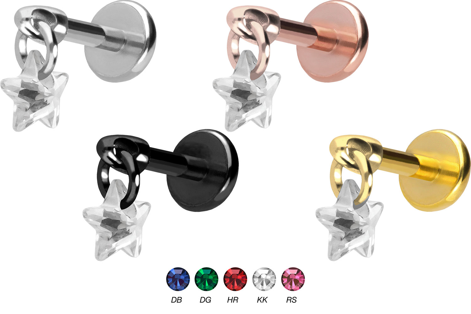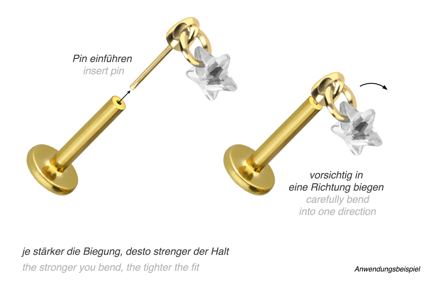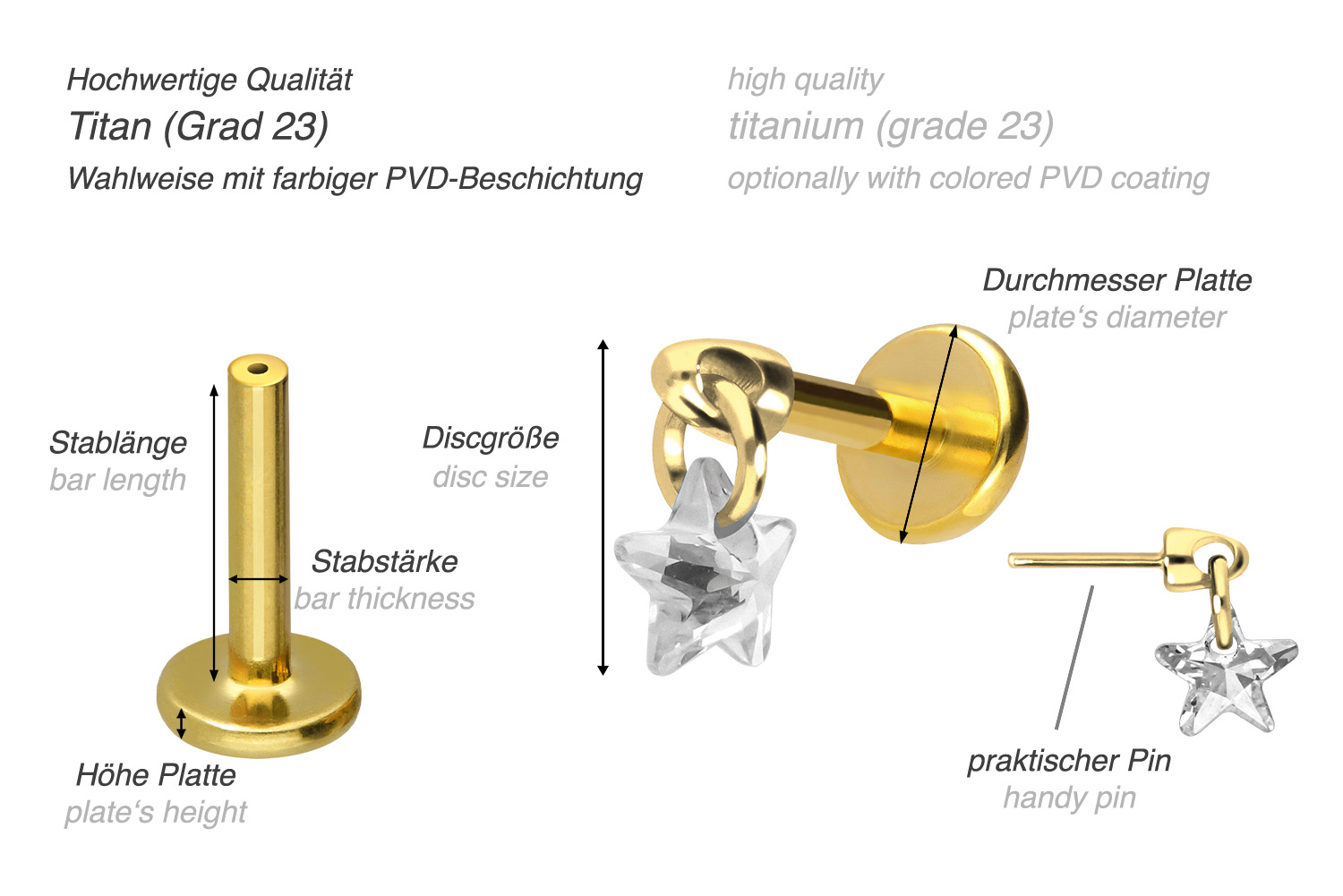 This unique labret is made of high quality titanium, which is also known for material properties such as particularly good skin compatibility and high durability. Another of its advantages is color fastness, also guaranteed in the colored versions with PVD coating. The labret is supplied with a timelessly beautiful attachment with push pin in form of a sparkling star, has a bar thickness of either 1 or 1.2 mm and is available with the bar lengths listed below. Due to the push fit technology used, the labret can be combined at will with all of our attachments with push pin.