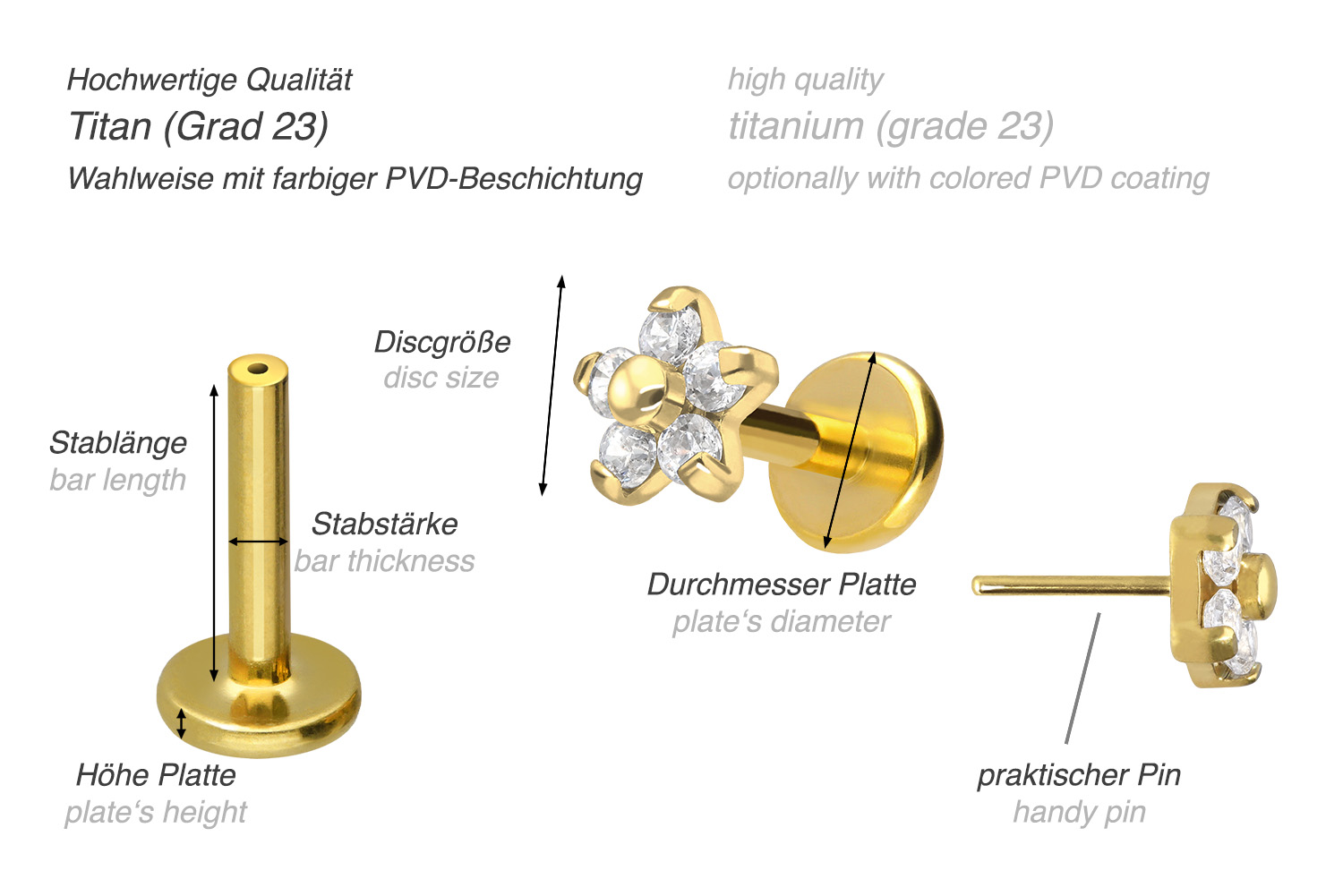 or 1.2 mm and is available with the bar lengths listed below. Due to the push fit technology used, the labret can be combined at will with all of our attachments with push pin.