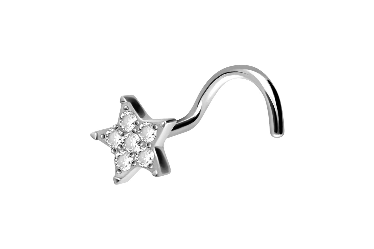 This stylish nose stud is made of high quality titanium, which is covered with a scratch-resistant PVD coating, depending on the color desired. Besides high quality, the material properties of titanium include good skin compatibility and durability. A better grip in the nose is guaranteed by the spiral shape. As a special highlight, the gorgeous piece of jewelry is adorned with an enchanting crystal star protected by a few settings. The nose stud has a bar thickness of 0.8 mm and a bar length of 6 mm.