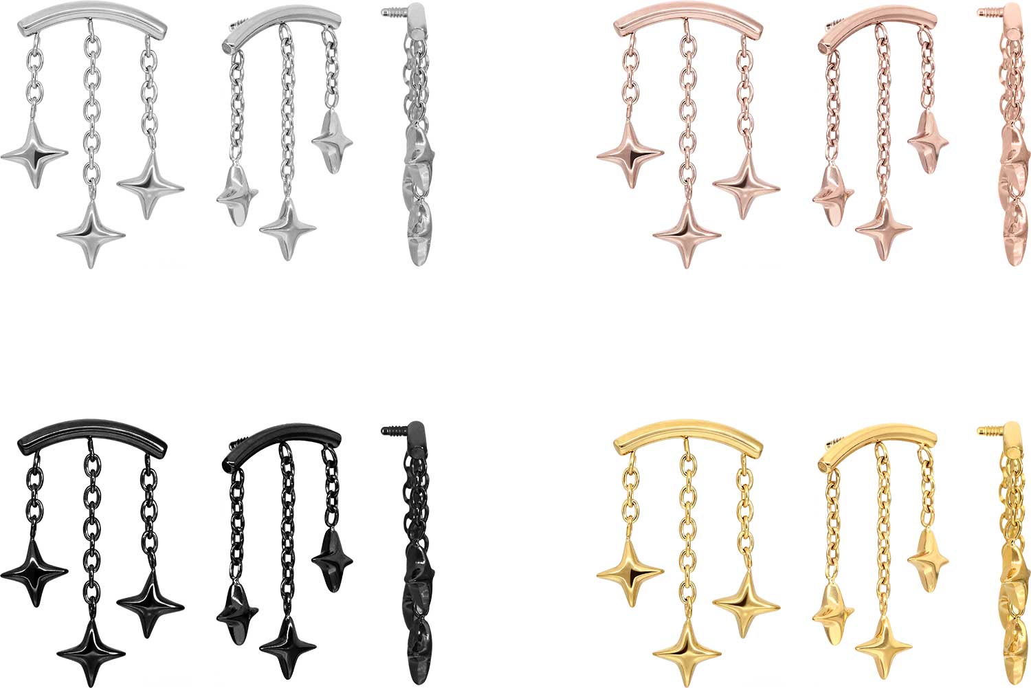 This timelessly beautiful screw-in attachment in the form of an arch, to which three stars are attached, was specially developed for our internal thread piercings and is made of high quality titanium, which among other advantages is characterized by good skin compatibility and high durability. Also one of its specific material properties is color fastness, guaranteed in the silver-colored variant as well as in the black, gold and rosegold-colored variants with PVD coating. Since the 0.9 mm external thread of the attachment is compatible with all our products with this kind of internal thread, there are various combination possibilities.