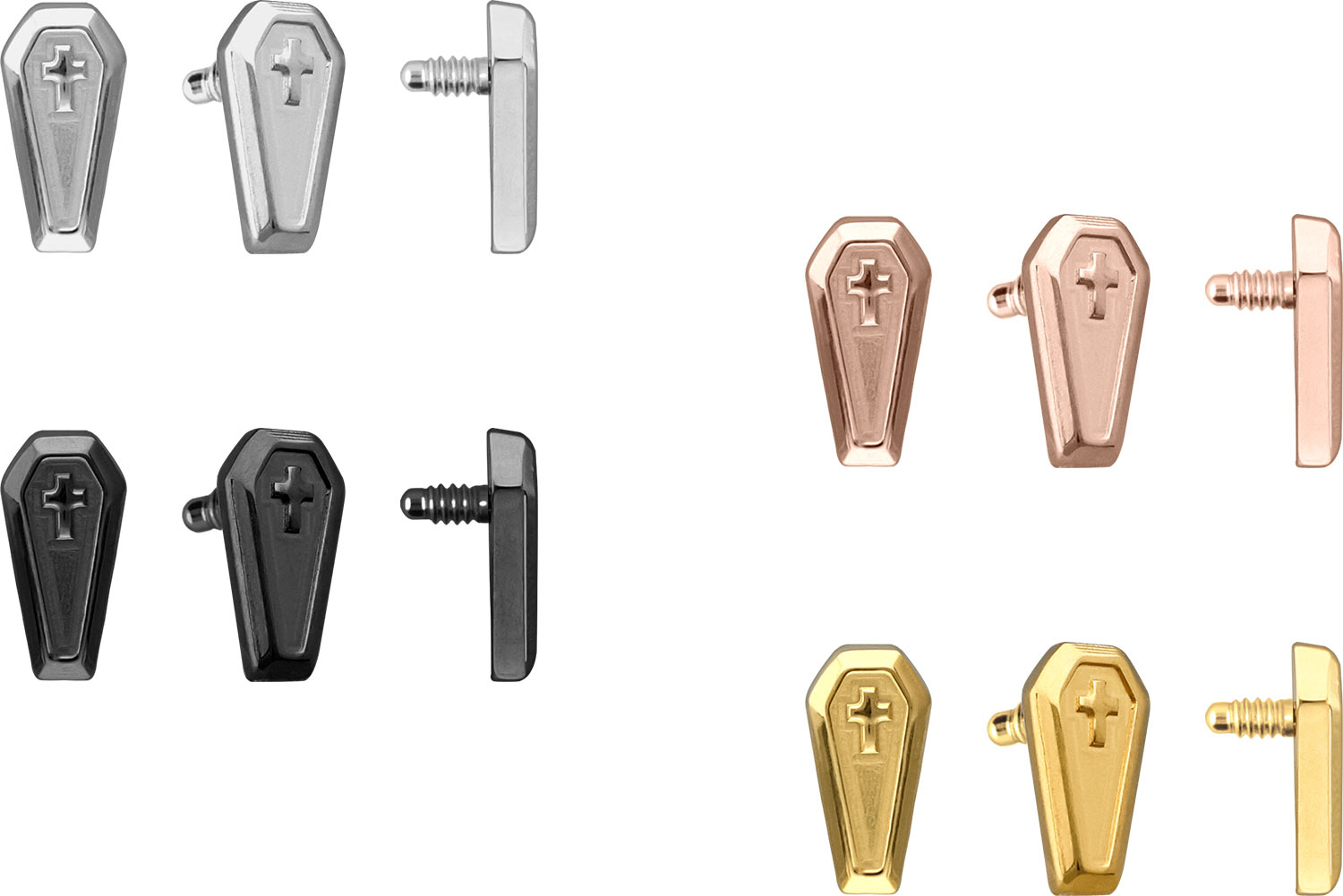 This timelessly beautiful screw-in attachment in the form of a coffin was specially developed for our internal thread piercings and is made of high quality titanium, which among other advantages is characterized by good skin compatibility and high durability. Also one of its specific material properties is color fastness, guaranteed in the silver-colored variant as well as in the black, gold and rosegold-colored variants with PVD coating. Since the 0.9 mm external thread of the attachment is compatible with all our products with this kind of internal thread, there are various combination possibilities.