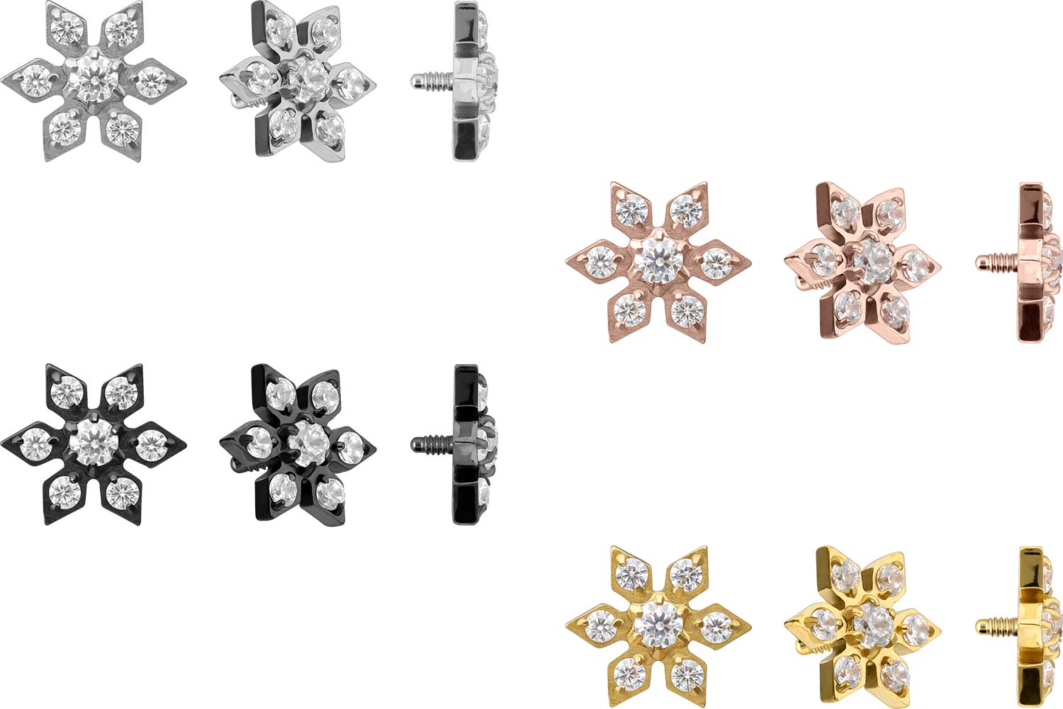 This timelessly beautiful screw-in attachment in the form of a crystal flower was specially developed for our internal thread piercings and is made of high quality titanium, which among other advantages is characterized by good skin compatibility and high durability. Also one of its specific material properties is color fastness, guaranteed in the silver-colored variant as well as in the black, gold and rosegold-colored variants with PVD coating. Since the 0.9 mm external thread of the attachment is compatible with all our products with this kind of internal thread, there are various combination possibilities.