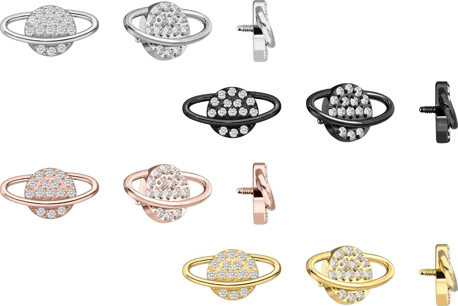 This timelessly beautiful screw-in attachment in the form of a crystal planet was specially developed for our internal thread piercings and is made of high quality titanium, which among other advantages is characterized by good skin compatibility and high durability. Also one of its specific material properties is color fastness, guaranteed in the silver-colored variant as well as in the black, gold and rosegold-colored variants with PVD coating. Since the 0.9 mm external thread of the attachment is compatible with all our products with this kind of internal thread, there are various combination possibilities.
