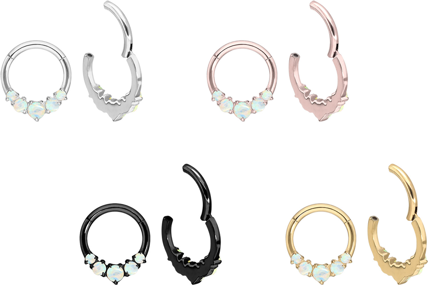 Easy handling and gorgeous design - that is what our clickers are all about! The main feature of the clickers is the practical hinge, which simplifies the insertion. The material used for manufacturing (titanium grade 23) is characterized by its good skin compatibility, high quality and durability. Depending on the desired color, the piercing is covered with a scratch-resistant PVD coating. As a special highlight the design reminding of five synthetic opals adorns the piece of jewelry. Whether at the ear, the nose or the lip - our clickers are suitable for a variety of different piercing locations. This clicker has a bar thickness of 1.2 mm, while its available inner diameter is 8 mm.Material: synthetic opal / titanium (grade 23)