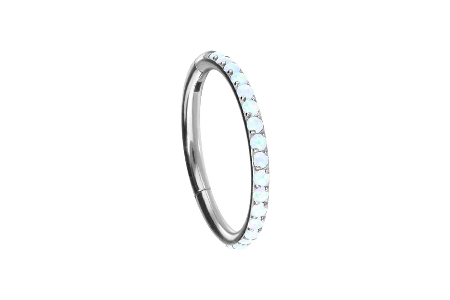 durability. Depending on the desired color, the piercing is covered with a scratch-resistant PVD coating. Thanks to the shimmering synthetic opals, which run along the ring, the delightful piece of jewelry acquires a unique charm. Whether at the ear, the nose or the lip - our clickers are suitable for a variety of