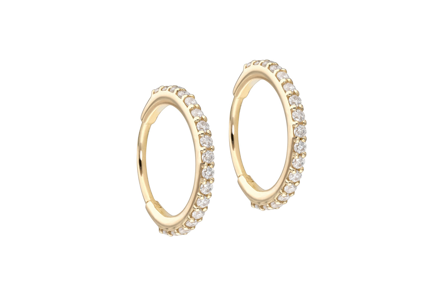 Einfache Handhabung und schönes Design - das sind unsere Ohrcicker! Als Hauptmerkmal der Clicker zählt das praktische Scharnier, das den Einsatz in den Stichkanal enorm erleichtert. Diese edle Schmuckstück besteht mit Ausnahme der Moissanite vollständig aus hochwertigem 14 Karat (585er) und 18 Karat (750) Gelbgold, das neben seiner exzellenten Qualität auch mit Eigenschaften wie guter Hautverträglichkeit und hoher Beständigkeit zu begeistern weiß. Der Moissanit verleiht dem Schmuckstück seinen außergewöhnlichen, diamantenähnlichen Glanz. Jeder Einzelne unserer Artikel aus Gold wird mit viel Liebe zum Detail in Handarbeit gefertigt und ist somit ein Unikat. Dank der funkelnden Moissanite mit Fassungen eignen sich die Creolen wunderbar als alltägliche Begleiter. Der in den Stichkanal einzuführende Stab hat eine Stärke von 0,8 mm, wohingegen die Stärke des sichtbaren Designs 1,2 mm beträgt. Die Creolen werden wie abgebildet paarweise geliefert.