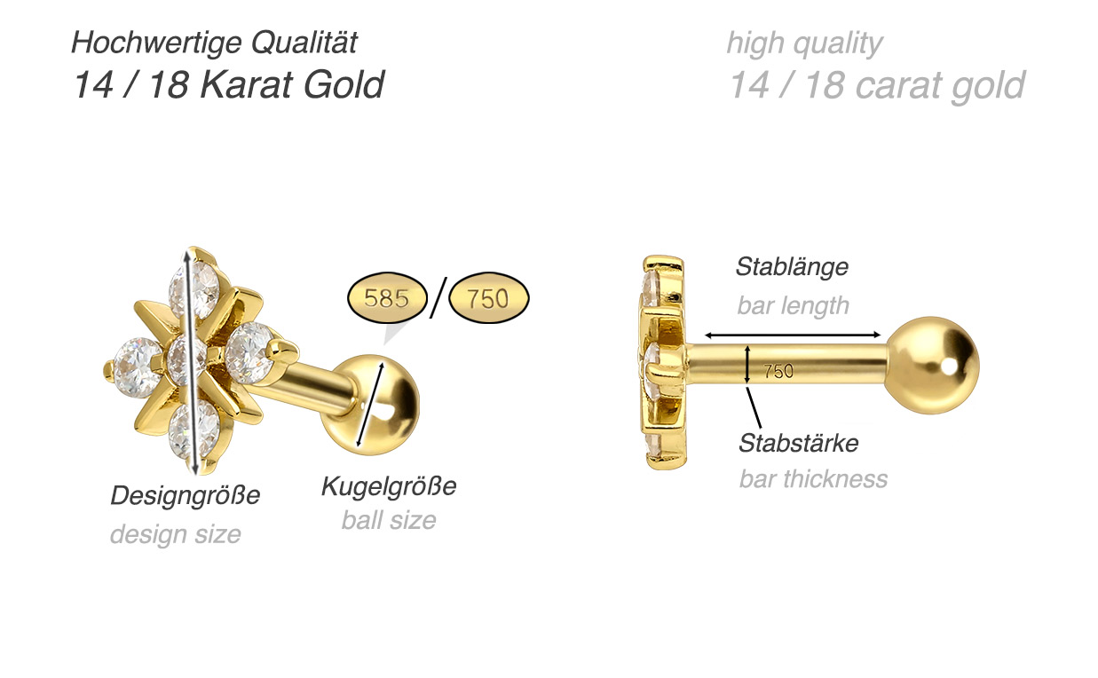 Dieses edle Ohrpiercing besteht mit Ausnahme der Moissanite vollständig aus hochwertigem 14 Karat (585er) oder 18 Karat (750er) Gelbgold, das neben seiner exzellenten Qualität auch mit Eigenschaften wie guter Hautverträglichkeit und hoher Beständigkeit zu begeistern weiß. Der Moissanit verleiht dem Schmuckstück seinen außergewöhnlichen, diamantenähnlichen Glanz. Jeder Einzelne unserer Artikel aus Gold wird mit viel Liebe zum Detail in Handarbeit gefertigt und ist somit ein Unikat. Die hintere Kugel dieses bezaubernden Schmuckstücks kann abgeschraubt werden, während das vordere Design in Form eines Sterns fest mit dem Stab verbunden ist. Besagter Stab verfügt stets über eine Stärke von 1,2 mm, wohingegen seine Länge 6 mm beträgt.
