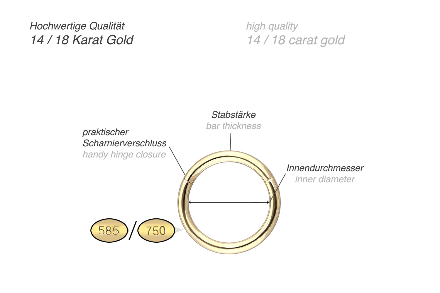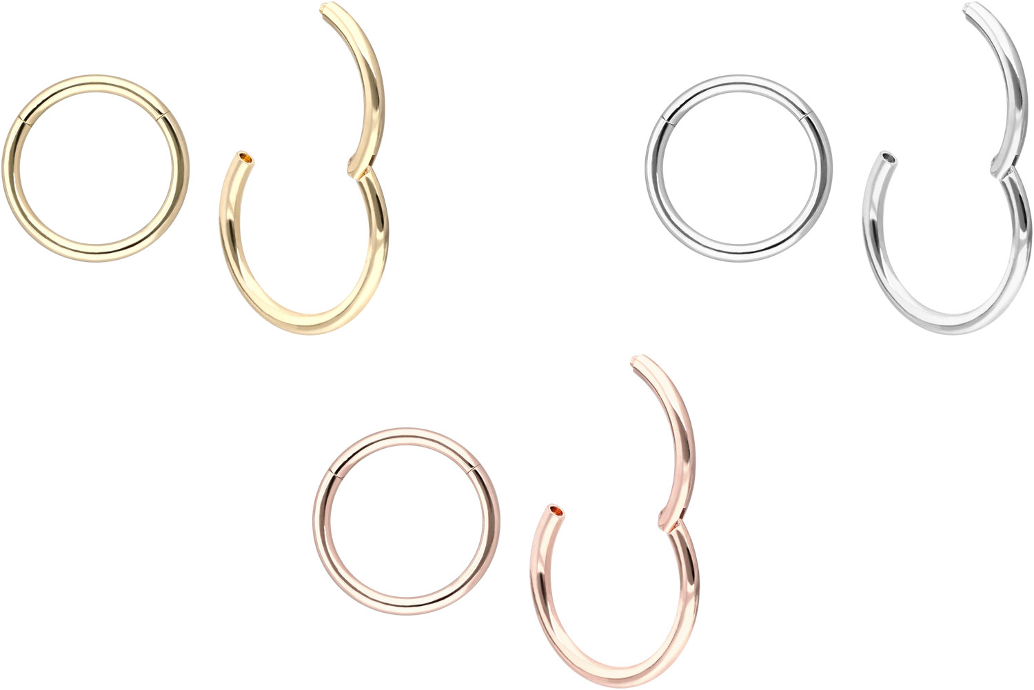Hautverträglichkeit, hochwertige Qualität und hohe Beständigkeit aus. Farblich ist das edle Schmuckstück in Gelbgold, Roségold und rhodiniertem Weißgold erhältlich. Sein ebenso zeitlos schönes, wie schlichtes Design ist ein echter Hingucker. Ob am Ohr, der Nase, oder der Lippe - unsere Clicker sind für die verschiedensten Piercingstellen geeignet.