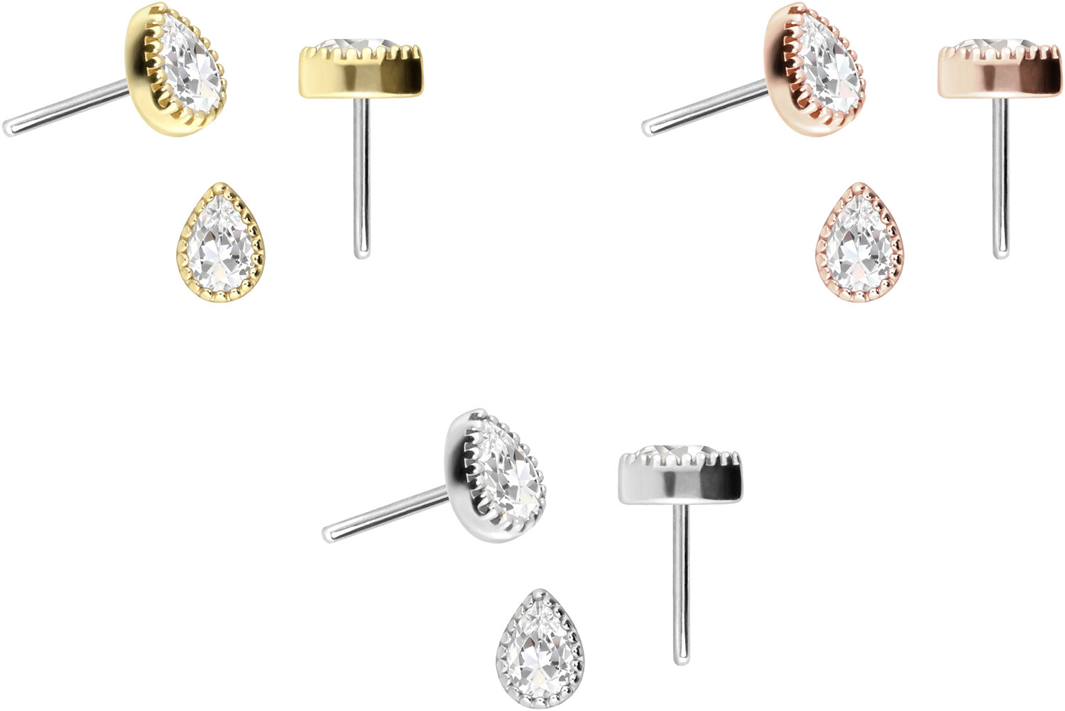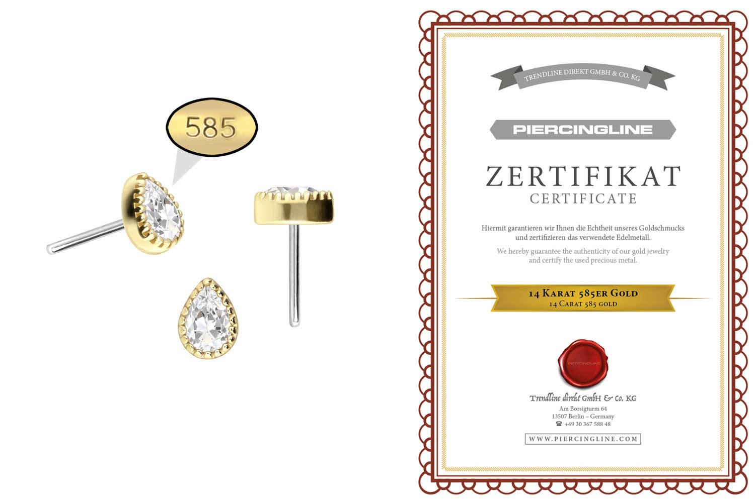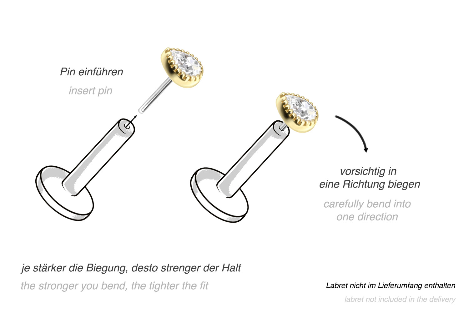 Das Design dieses zeitlos schönen Push Pin Aufsatzes besteht mit Ausnahme des Moissanits in Form eines Tropfens vollständig aus hochwertigem 14 Karat (585er) Gold, das neben seiner exzellenten Qualität auch mit Eigenschaften wie guter Hautverträglichkeit und hoher Beständigkeit zu begeistern weiß. Lediglich der Push Pin ist aus Titan (Grad 23) gefertigt. Farblich ist er in Gelbgold, Roségold und rhodiniertem Weißgold erhältlich. Der Moissanit verleiht dem Schmuckstück seinen außergewöhnlichen, diamantenähnlichen Glanz. Jeder Einzelne unserer Artikel aus Gold wird mit viel Liebe zum Detail in Handarbeit gefertigt und ist somit ein Unikat. Zum Einsetzen muss der Pin nach Belieben gebogen werden. Es ist zu beachten, dass ein festerer Halt gewährleistet ist, wenn der Pin ein bisschen stärker gebogen wird. Der Push Pin des Aufsatzes ist mit all unseren 14 Karat (585er) Gold Produkten mit Push Fit kompatibel, sodass sich vielfältige Kombinationsmöglichkeiten ergeben.
