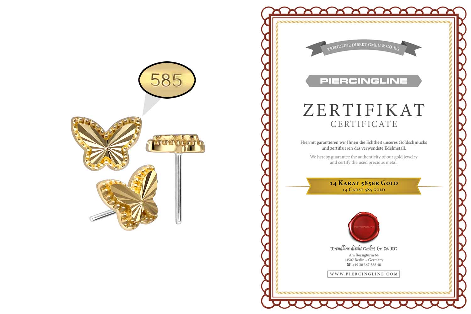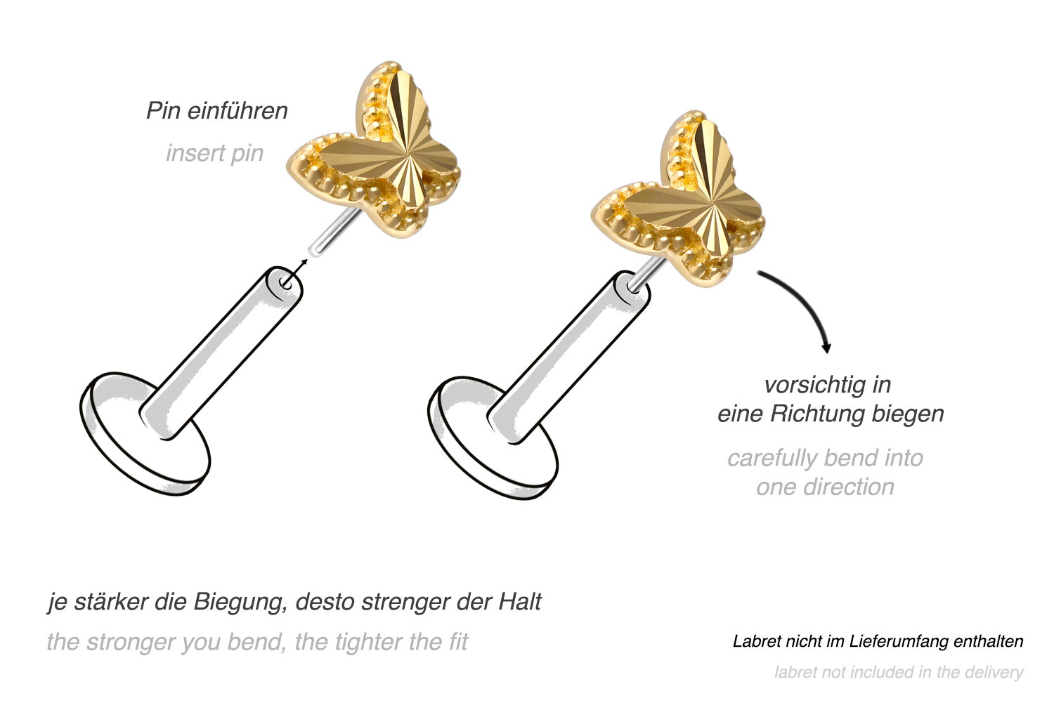 Dieser zeitlos schöne Push Pin Aufsatz in Form eines Schmetterlings besteht vollständig aus hochwertigem 14 Karat (585er) Gold, das neben seiner exzellenten Qualität auch mit Eigenschaften wie guter Hautverträglichkeit und hoher Beständigkeit zu begeistern weiß. Lediglich der Push Pin ist aus Titan (Grad 23) gefertigt. Farblich ist er in Gelbgold, Roségold und rhodiniertem Weißgold erhältlich. Jeder Einzelne unserer Artikel aus Gold wird mit viel Liebe zum Detail in Handarbeit gefertigt und ist somit ein Unikat. Zum Einsetzen muss der Pin nach Belieben gebogen werden. Es ist zu beachten, dass ein festerer Halt gewährleistet ist, wenn der Pin ein bisschen stärker gebogen wird. Der Push Pin des Aufsatzes ist mit all unseren Gold Produkten mit Push Fit kompatibel, sodass sich vielfältige Kombinationsmöglichkeiten ergeben.
