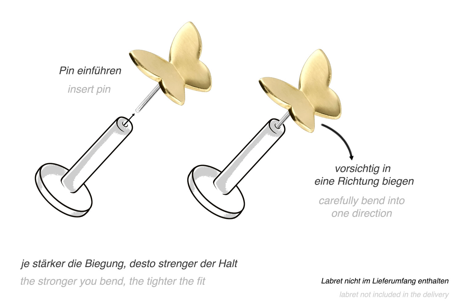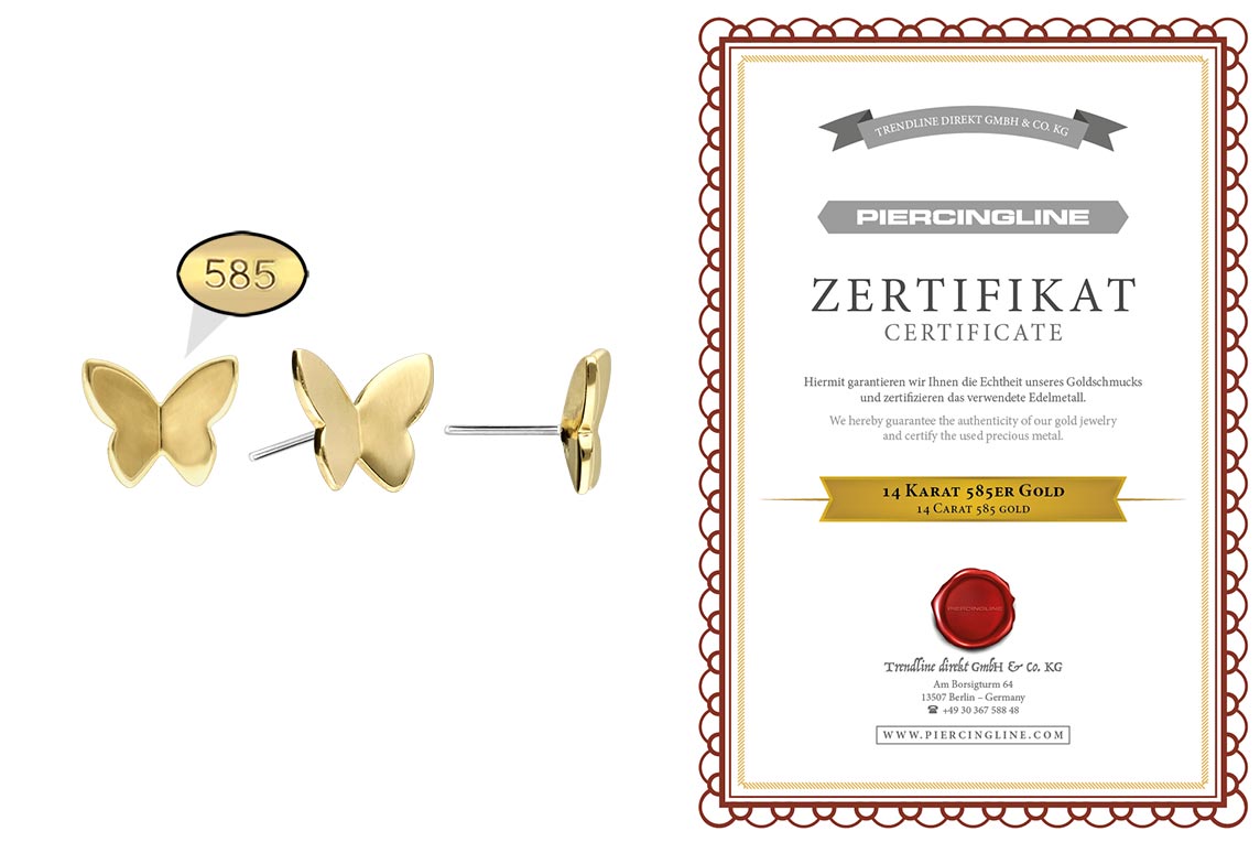 Dieser zeitlos schöne Push Pin Aufsatz in Form eines Schmetterlings besteht vollständig aus hochwertigem 14 Karat (585er) Gold, das neben seiner exzellenten Qualität auch mit Eigenschaften wie guter Hautverträglichkeit und hoher Beständigkeit zu begeistern weiß. Lediglich der Push Pin ist aus Titan (Grad 23) gefertigt. Farblich ist er in Gelbgold, Roségold und rhodiniertem Weißgold erhältlich. Jeder Einzelne unserer Artikel aus 14-karätigem Gold wird mit viel Liebe zum Detail in Handarbeit gefertigt und ist somit ein Unikat. Zum Einsetzen muss der Pin nach Belieben gebogen werden. Es ist zu beachten, dass ein festerer Halt gewährleistet ist, wenn der Pin ein bisschen stärker gebogen wird. Der Push Pin des Aufsatzes ist mit all unseren 14 Karat (585er) Gold Produkten mit Push Fit kompatibel, sodass sich vielfältige Kombinationsmöglichkeiten ergeben.