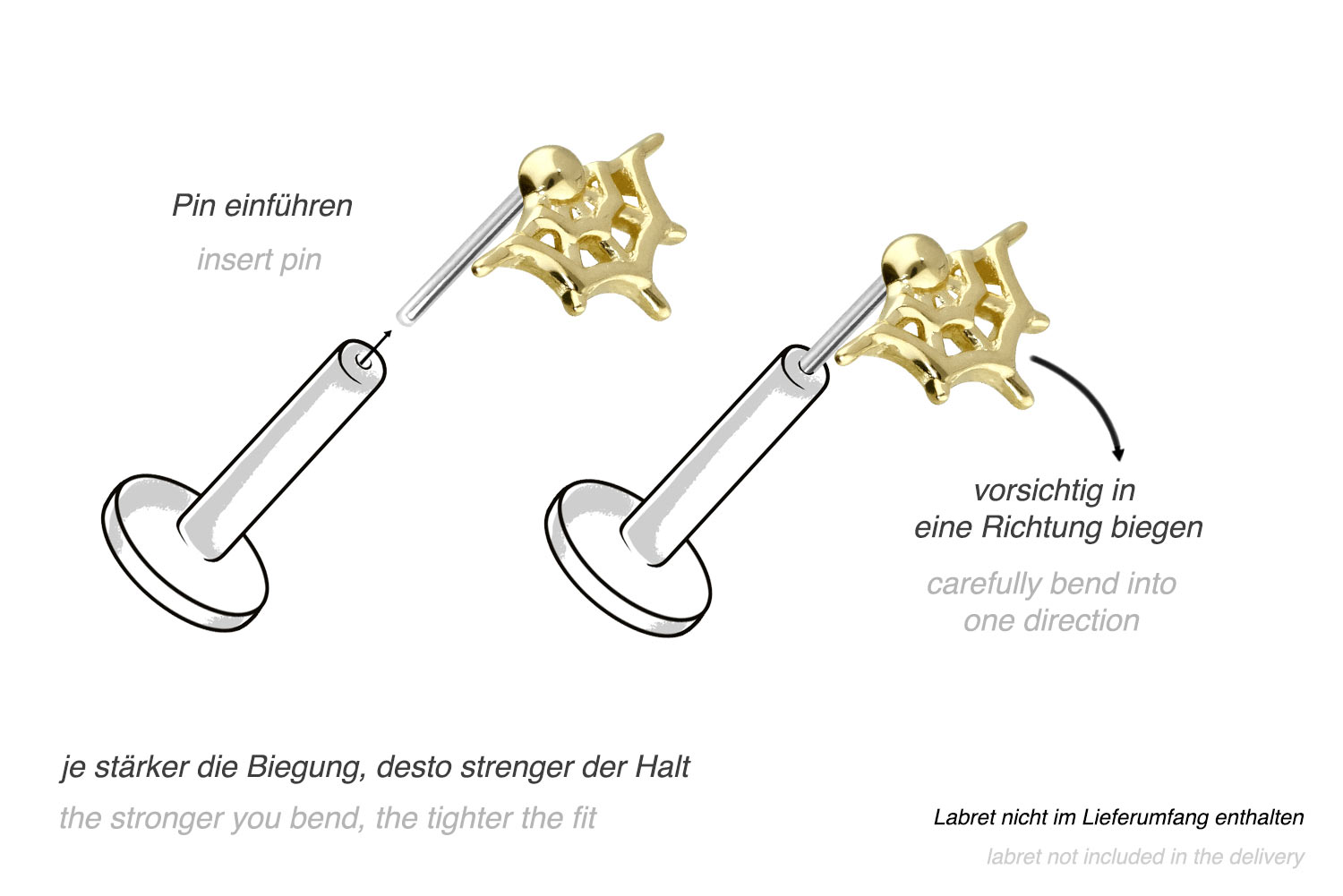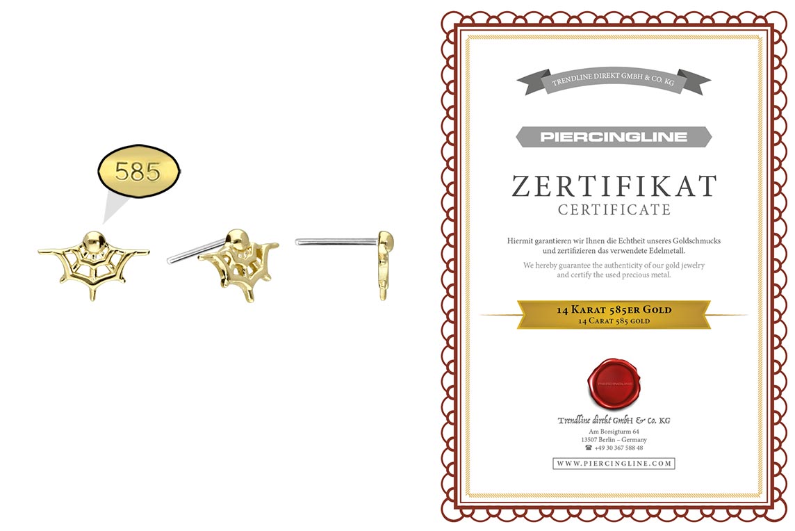 Dieser zeitlos schöne Push Pin Aufsatz in Form eines Spinnennetzes besteht vollständig aus hochwertigem 14 Karat (585er) Gold, das neben seiner exzellenten Qualität auch mit Eigenschaften wie guter Hautverträglichkeit und hoher Beständigkeit zu begeistern weiß. Lediglich der Push Pin ist aus Titan (Grad 23) gefertigt. Farblich ist er in Gelbgold, Roségold und rhodiniertem Weißgold erhältlich. Jeder Einzelne unserer Artikel aus 14-karätigem Gold wird mit viel Liebe zum Detail in Handarbeit gefertigt und ist somit ein Unikat. Zum Einsetzen muss der Pin nach Belieben gebogen werden. Es ist zu beachten, dass ein festerer Halt gewährleistet ist, wenn der Pin ein bisschen stärker gebogen wird. Der Push Pin des Aufsatzes ist mit all unseren 14 Karat (585er) Gold Produkten mit Push Fit kompatibel, sodass sich vielfältige Kombinationsmöglichkeiten ergeben.