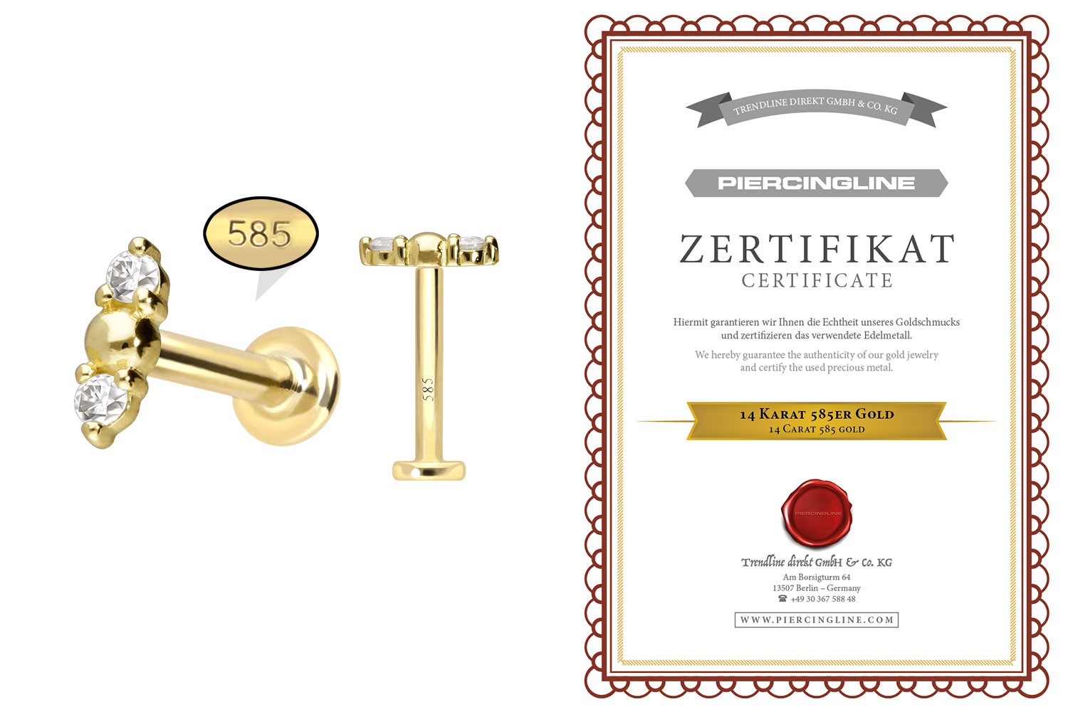 Dieses Labret ist mit Ausnahme der Moissanite vollständig aus hochwertigem 14 Karat (585er) Gold gefertigt, das neben seiner exzellenten Qualität auch mit Eigenschaften wie guter Hautverträglichkeit und hoher Beständigkeit zu begeistern weiß. Farblich ist es in Gelbgold, Roségold und rhodiniertem Weißgold erhältlich. Das Labret mit Außengewinde hat