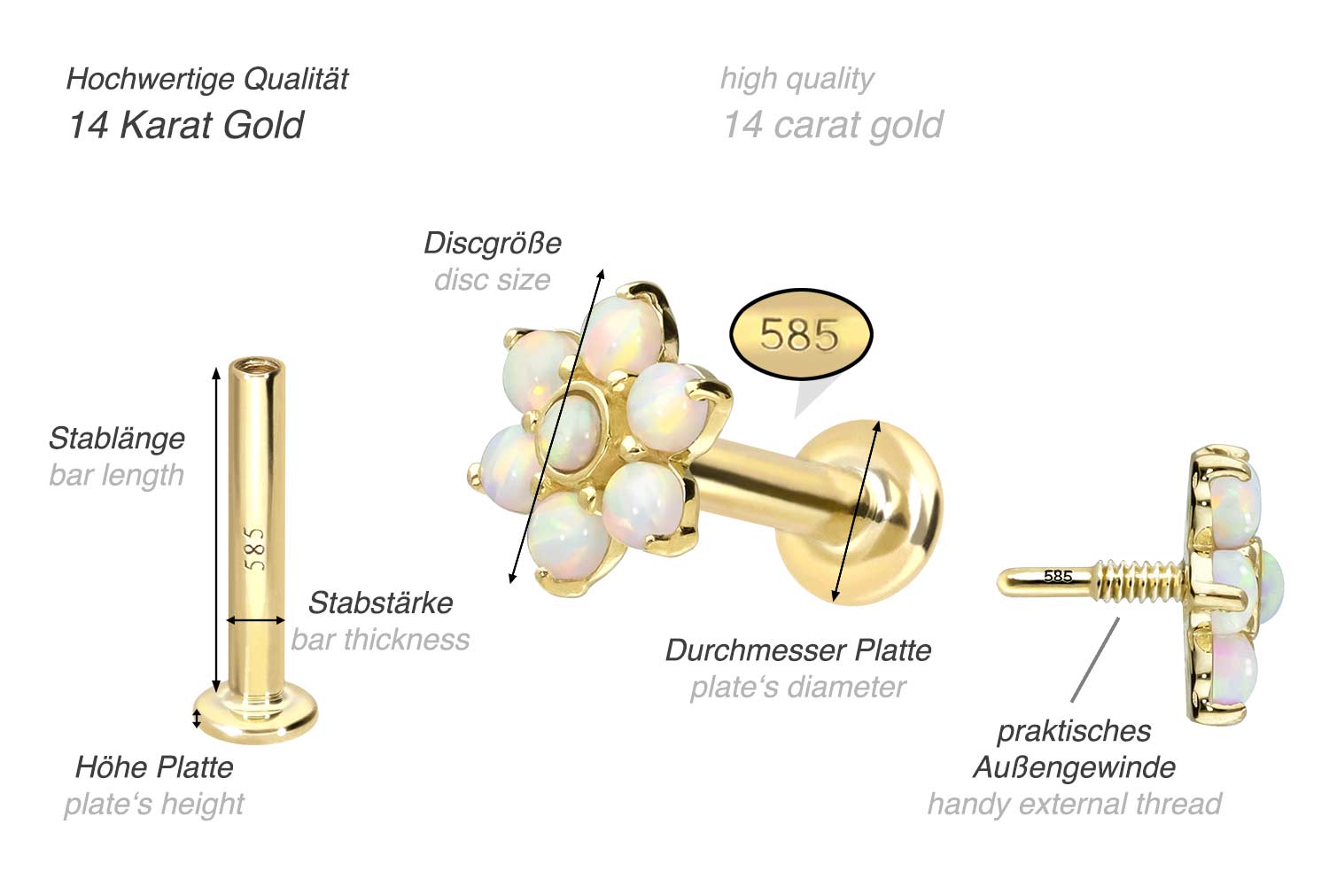 Dieses Labret ist mit Ausnahme der synthetischen Opale vollständig aus hochwertigem 14 Karat (585er) Gold gefertigt, das neben seiner exzellenten Qualität auch mit Eigenschaften wie guter Hautverträglichkeit und hoher Beständigkeit zu begeistern weiß. Farblich ist es in Gelbgold, Roségold und rhodiniertem Weißgold erhältlich. Das Labret verfügt über einen zeitlos schönen Schraubaufsatz mit Außengewinde in Form einer Blume, hat