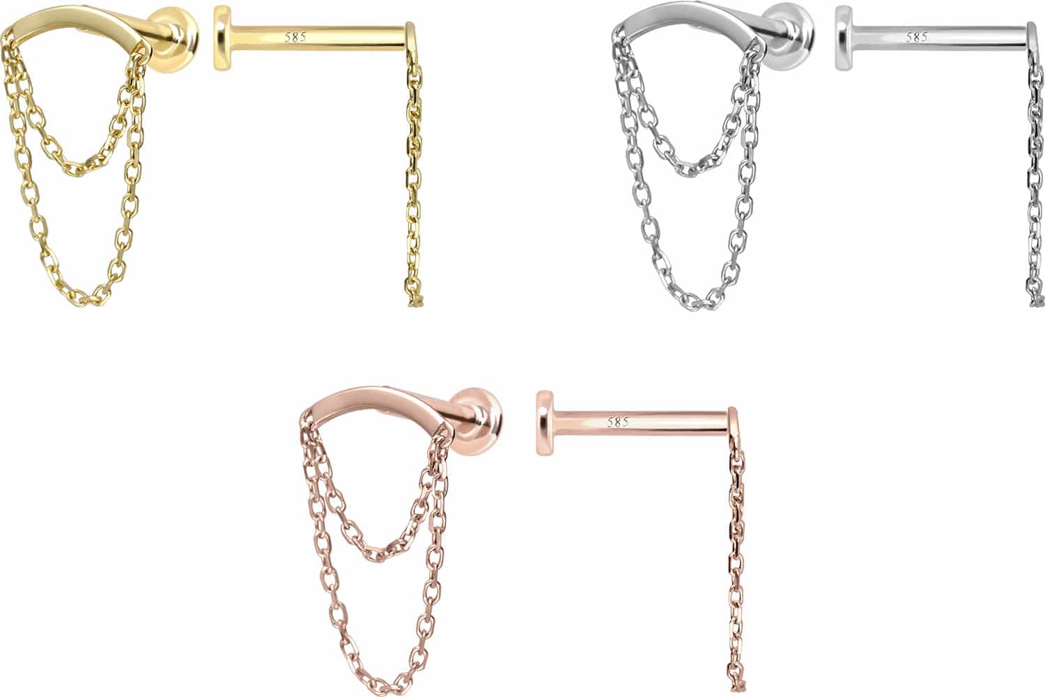 Dieses Labret ist vollständig aus hochwertigem 14 Karat (585er) Gold gefertigt, das neben seiner exzellenten Qualität auch mit Eigenschaften wie guter Hautverträglichkeit und hoher Beständigkeit zu begeistern weiß. Farblich ist es in Gelbgold, Roségold und rhodiniertem Weißgold erhältlich. Das Labret verfügt über einen zeitlos schönen Schraubaufsatz mit Außengewinde in Form eines Bogens, an welchem zwei Ketten befestigt sind, hat eine Stabstärke von entweder 1 oder 1,2 mm und ist in den