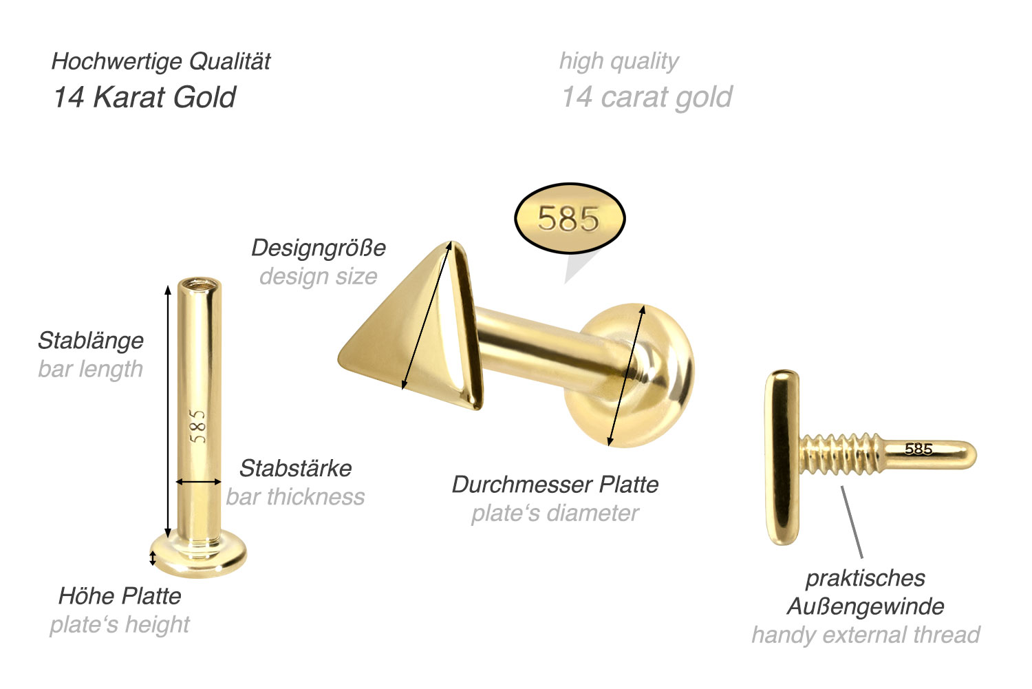 Dieses Labret ist vollständig aus hochwertigem 14 Karat (585er) Gold gefertigt, das neben seiner exzellenten Qualität auch mit Eigenschaften wie guter Hautverträglichkeit und hoher Beständigkeit zu begeistern weiß. Farblich ist es in Gelbgold, Roségold und rhodiniertem Weißgold erhältlich. Das Labret verfügt über einen zeitlos schönen Schraubaufsatz mit Außengewinde in Form eines Dreiecks, hat
