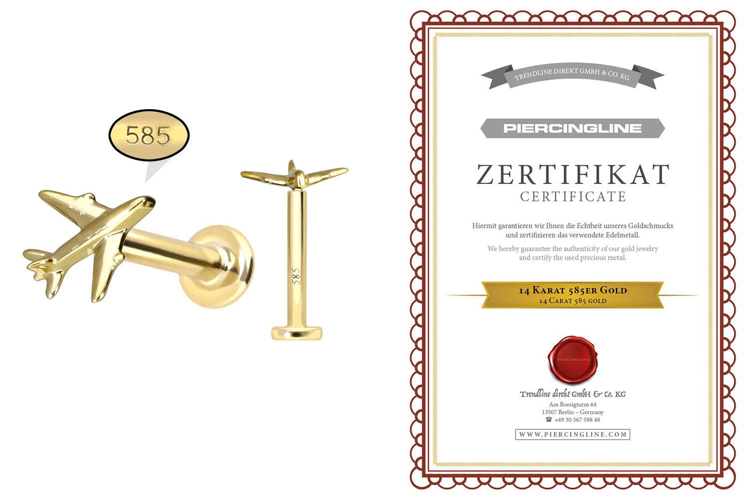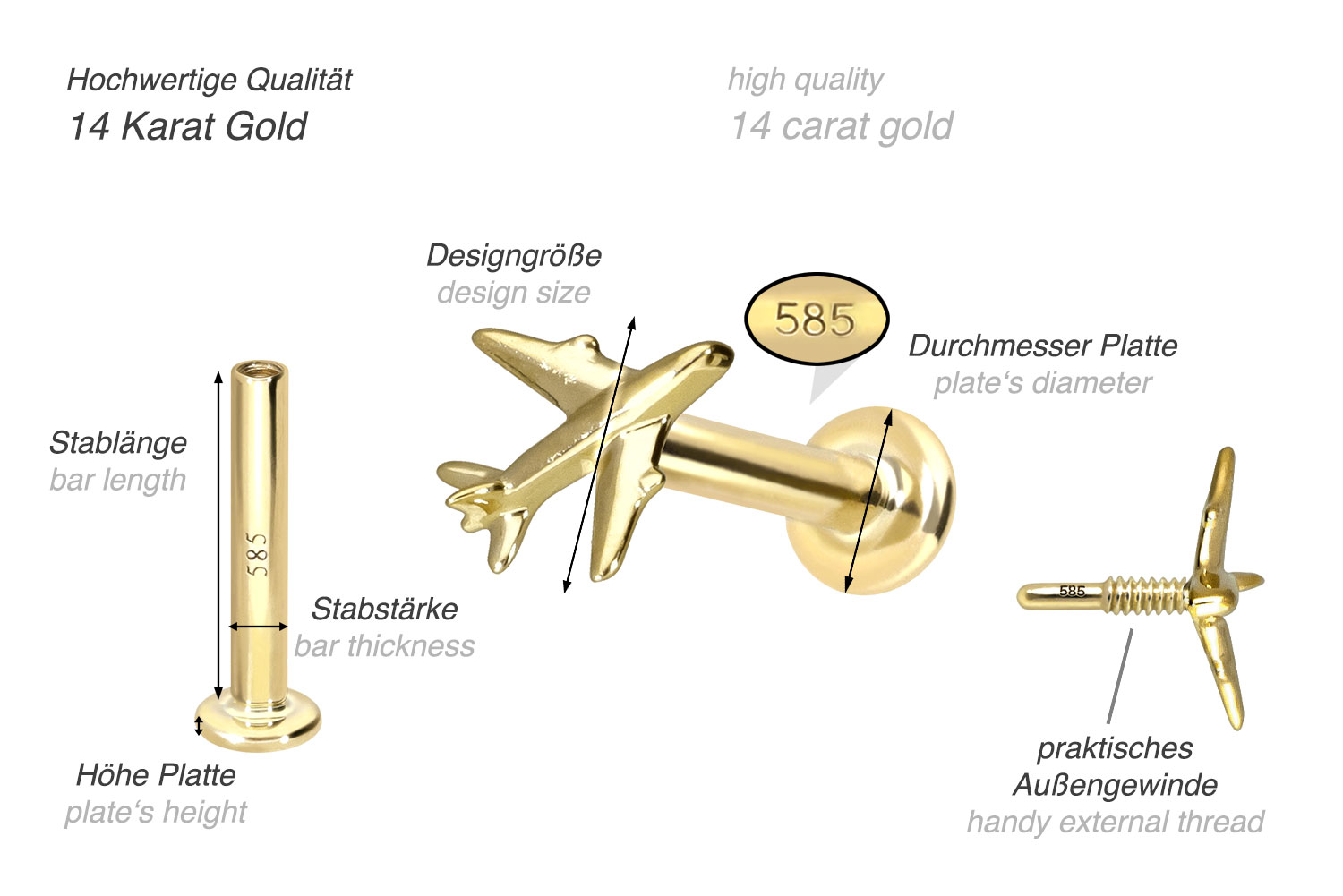 Dieses Labret ist vollständig aus hochwertigem 14 Karat (585er) Gold gefertigt, das neben seiner exzellenten Qualität auch mit Eigenschaften wie guter Hautverträglichkeit und hoher Beständigkeit zu begeistern weiß. Farblich ist es in Gelbgold, Roségold und rhodiniertem Weißgold erhältlich. Das Labret verfügt über einen zeitlos schönen Schraubaufsatz mit Außengewinde in Form eines Flugzeuges, hat