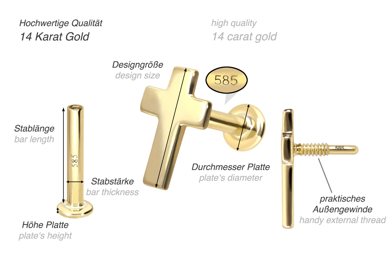 Dieses Labret ist vollständig aus hochwertigem 14 Karat (585er) Gold gefertigt, das neben seiner exzellenten Qualität auch mit Eigenschaften wie guter Hautverträglichkeit und hoher Beständigkeit zu begeistern weiß. Farblich ist es in Gelbgold, Roségold und rhodiniertem Weißgold erhältlich. Das Labret verfügt über einen zeitlos schönen Schraubaufsatz mit Außengewinde in Form eines Kreuzes, hat