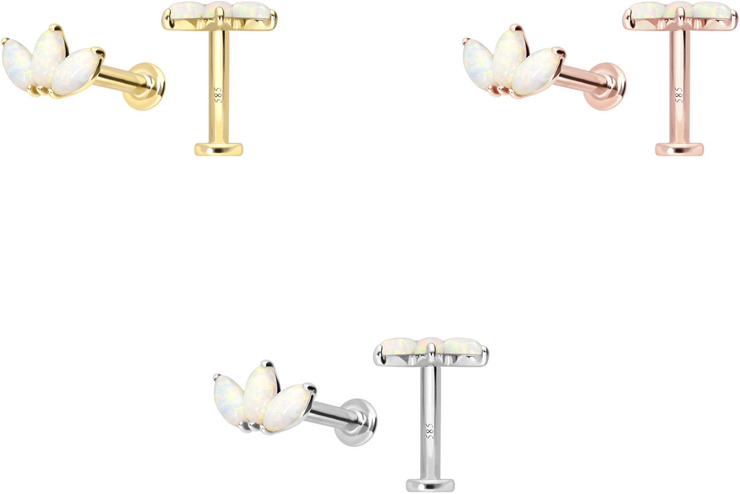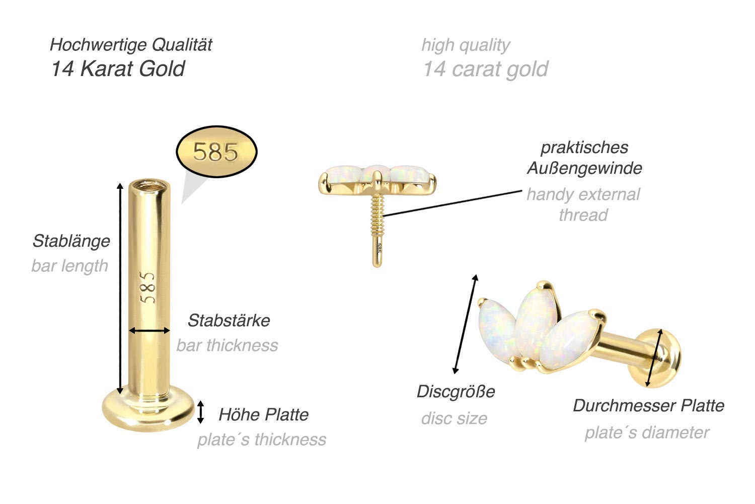 Dieses Labret ist mit Ausnhame der synthetischen Opale vollständig aus hochwertigem 14 Karat (585er) Gold gefertigt, das neben seiner exzellenten Qualität auch mit Eigenschaften wie guter Hautverträglichkeit und hoher Beständigkeit zu begeistern weiß. Farblich ist es in Gelbgold, Roségold und rhodiniertem Weißgold erhältlich. Das Labret verfügt über einen zeitlos schönen Schraubaufsatz mit Außengewinde in Form einer Lotusblüte, hat