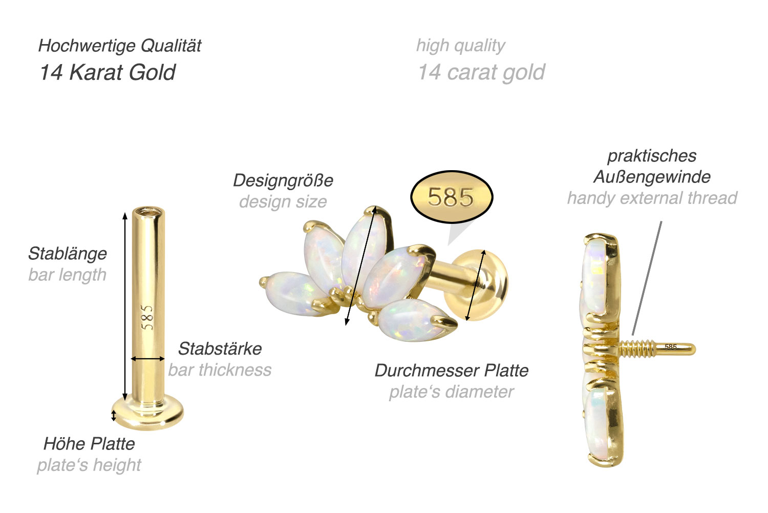 14 Karat Gold Labret mit Innengewinde LOTUSBLÜTE + SYNTHETISCHE OPALE