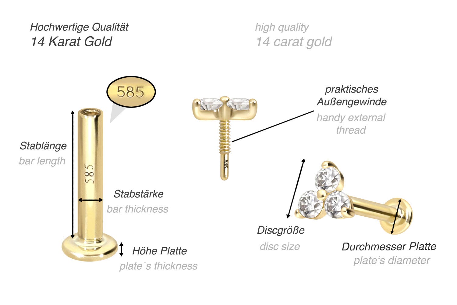 unten aufgeführten Stablängen erhältlich. Der Moissanit verleiht dem Schmuckstück seinen außergewöhnlichen, diamantenähnlichen Glanz. Jeder Einzelne unserer Artikel aus Gold wird mit viel Liebe zum Detail in Handarbeit gefertigt und ist somit ein Unikat. Das 0,8 mm starke Innengewinde des Labrets ist mit allen 14 Karat (585er) Gold Produkten, die über ein solches Außengewinde verfügen, kompatibel, sodass sich vielfältige Kombinationsmöglichkeiten ergeben.