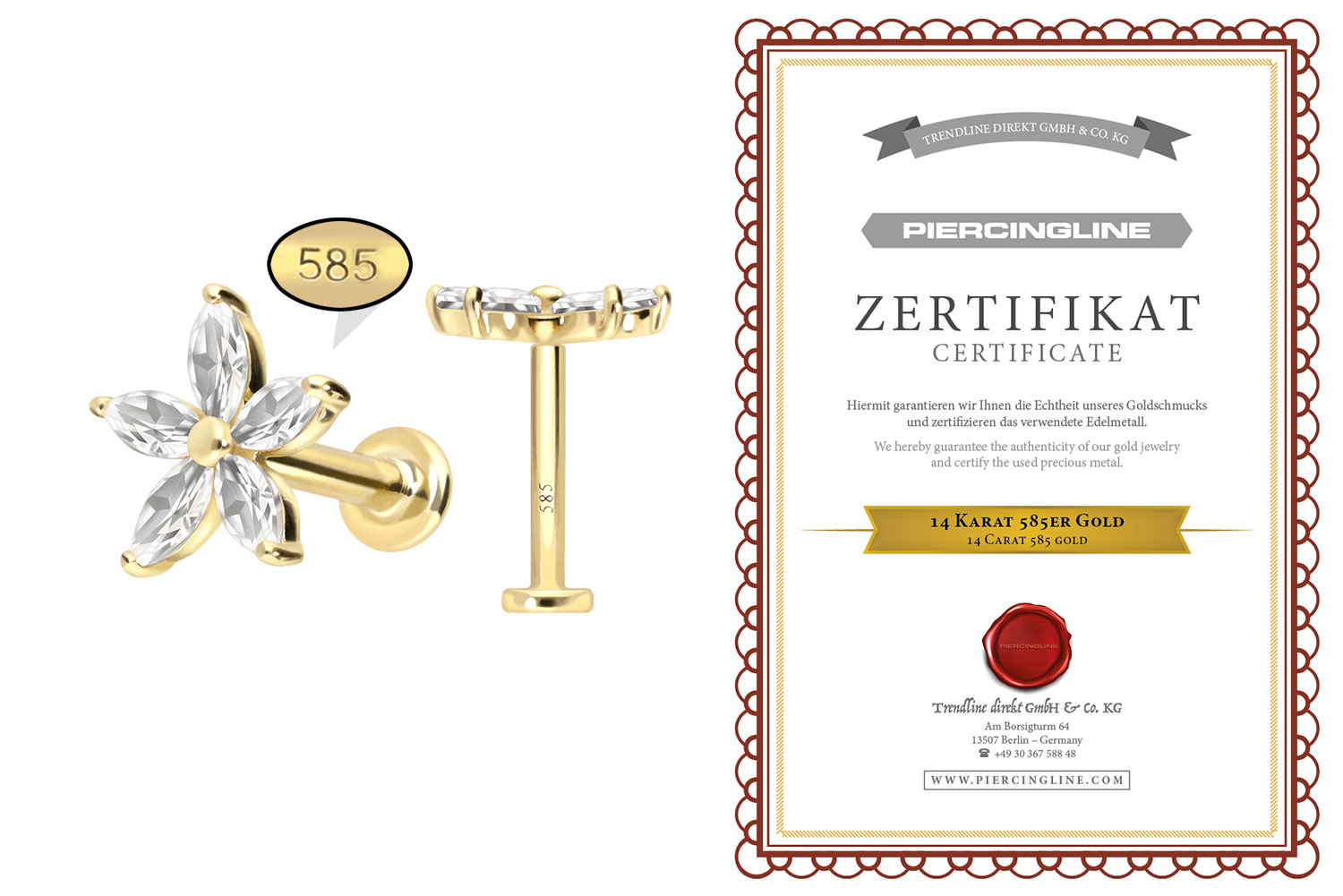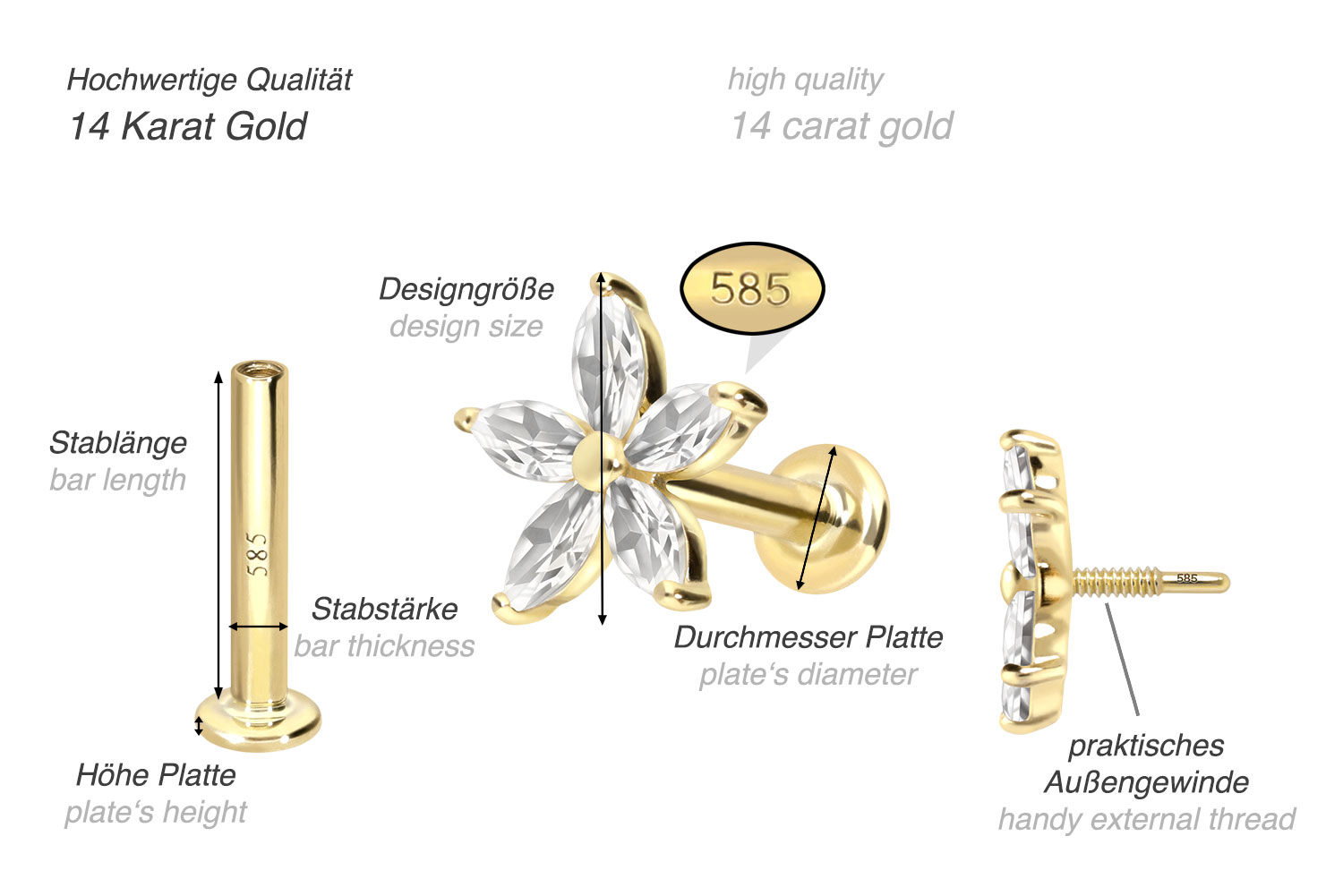 Dieses Labret ist mit Ausnahme der Moissanite vollständig aus hochwertigem 14 Karat (585er) Gold gefertigt, das neben seiner exzellenten Qualität auch mit Eigenschaften wie guter Hautverträglichkeit und hoher Beständigkeit zu begeistern weiß. Farblich ist es in Gelbgold, Roségold und rhodiniertem Weißgold erhältlich. Das Labret verfügt über einen zeitlos schönen Schraubaufsatz mit Außengewinde in Form einer Blume, hat