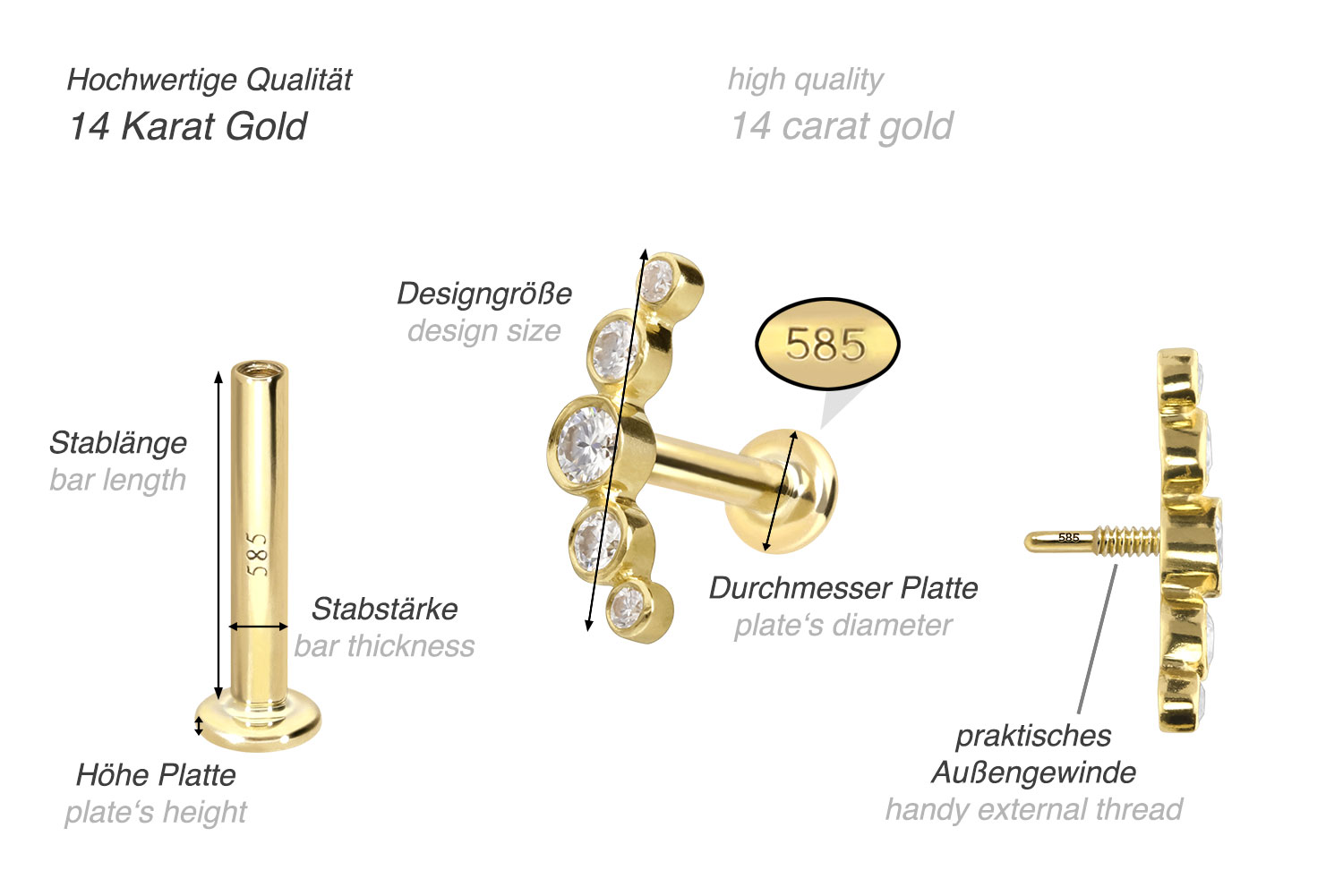 Dieses Labret ist mit Ausnahme der Moissanite vollständig aus hochwertigem 14 Karat (585er) Gold gefertigt, das neben seiner exzellenten Qualität auch mit Eigenschaften wie guter Hautverträglichkeit und hoher Beständigkeit zu begeistern weiß. Farblich ist es in Gelbgold, Roségold und rhodiniertem Weißgold erhältlich. Das Labret verfügt über einen zeitlos schönen Schraubaufsatz mit Außengewinde, hat