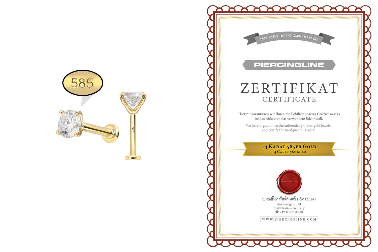 Dieses Labret ist mit Ausnahme des Moissanits vollständig aus hochwertigem 14 Karat (585er) Gold gefertigt, das neben seiner exzellenten Qualität auch mit Eigenschaften wie guter Hautverträglichkeit und hoher Beständigkeit zu begeistern weiß. Farblich ist es in Gelbgold, Roségold und rhodiniertem Weißgold erhältlich. Das Labret verfügt über einen zeitlos schönen Schraubaufsatz mit Außengewinde, hat