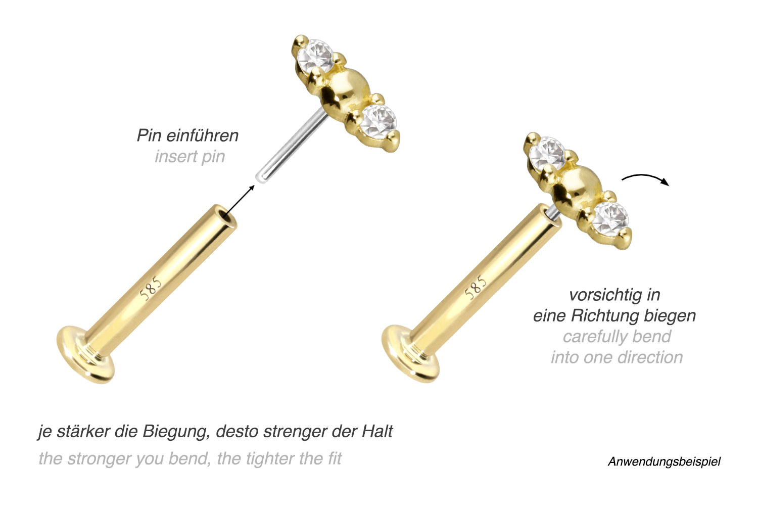 Dieses Labret ist mit Ausnahme der Moissanite aus hochwertigem 14 Karat (585er) Gold gefertigt, das neben seiner exzellenten Qualität auch mit Eigenschaften wie guter Hautverträglichkeit und hoher Beständigkeit zu begeistern weiß. Farblich ist es in Gelbgold, Roségold und rhodiniertem Weißgold erhältlich. Das Labret verfügt über einen zeitlos schönen Aufsatz mit Titan Push Pin, hat eine Stabstärke von entweder 1 oder 1,2 mm und ist in den unten aufgeführten Stablängen erhältlich. Der Moissanit verleiht dem Schmuckstück seinen außergewöhnlichen, diamantenähnlichen Glanz. Jeder Einzelne unserer Artikel aus Gold wird mit viel Liebe zum Detail in Handarbeit gefertigt und ist somit ein Unikat. Durch die verwendete Push Fit Technologie kann das Labret nach Belieben mit all unseren Gold Aufsätzen mit Titan Push Pin kombiniert werden.