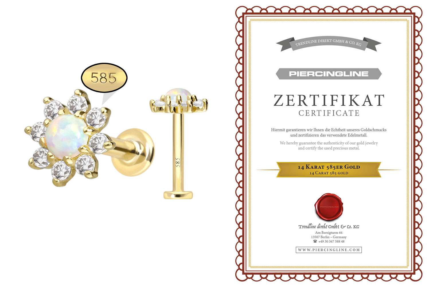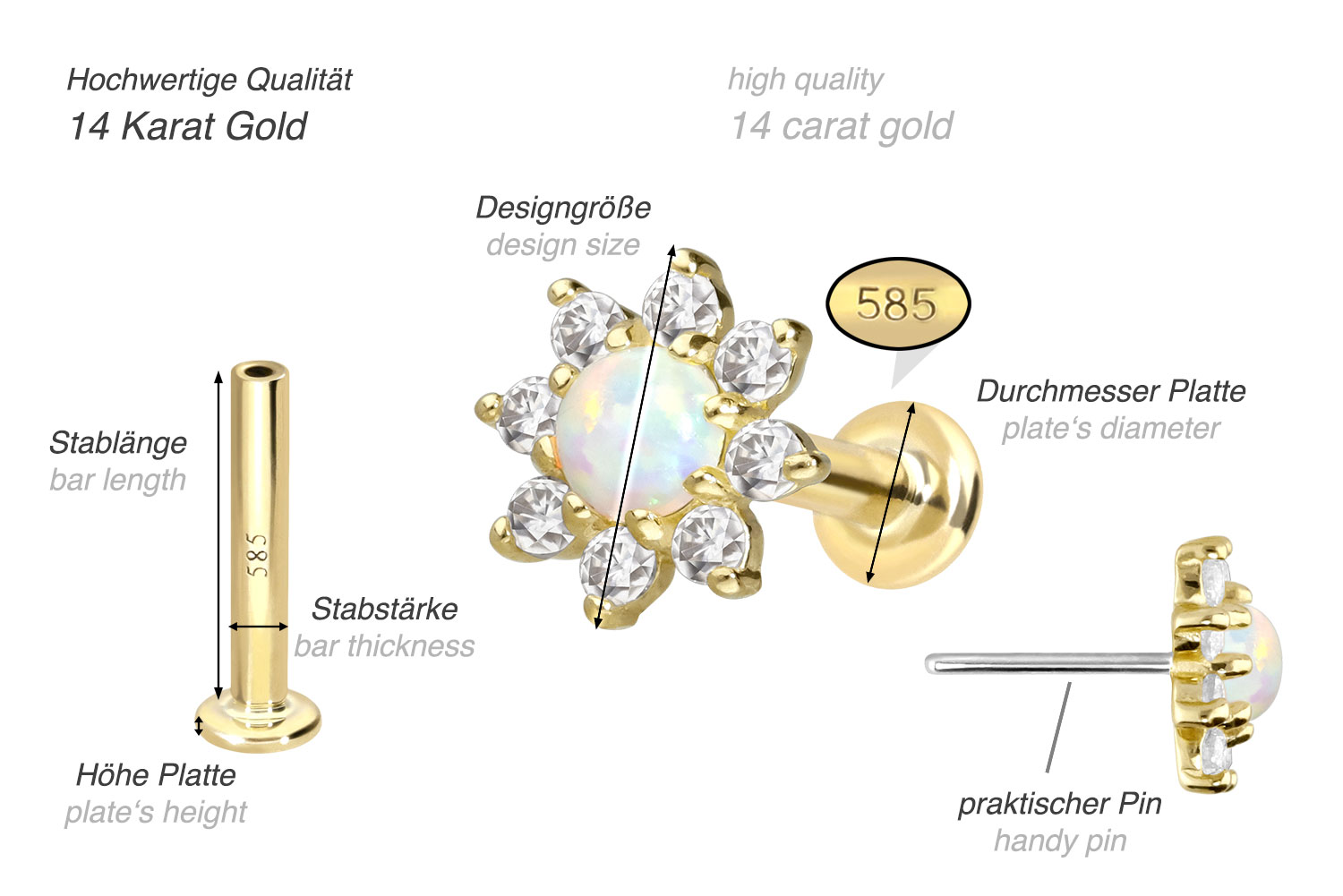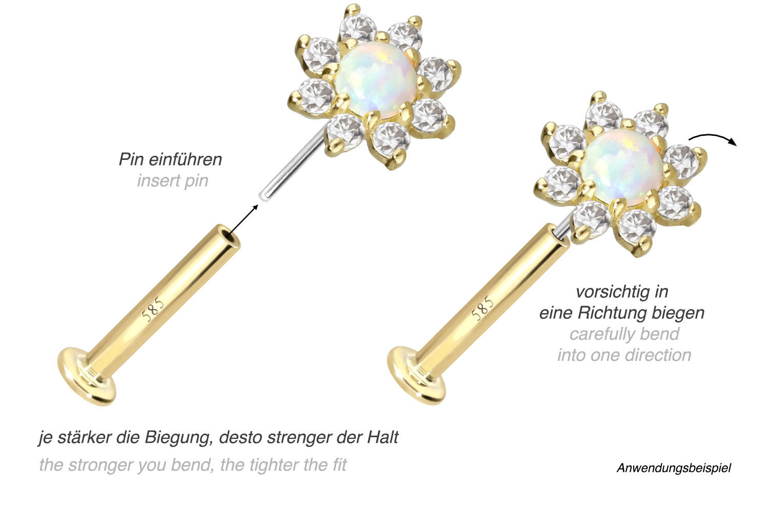 14 Karat Gold - Labret mit Push Fit Moissanit-Blume + synthetischer Opal