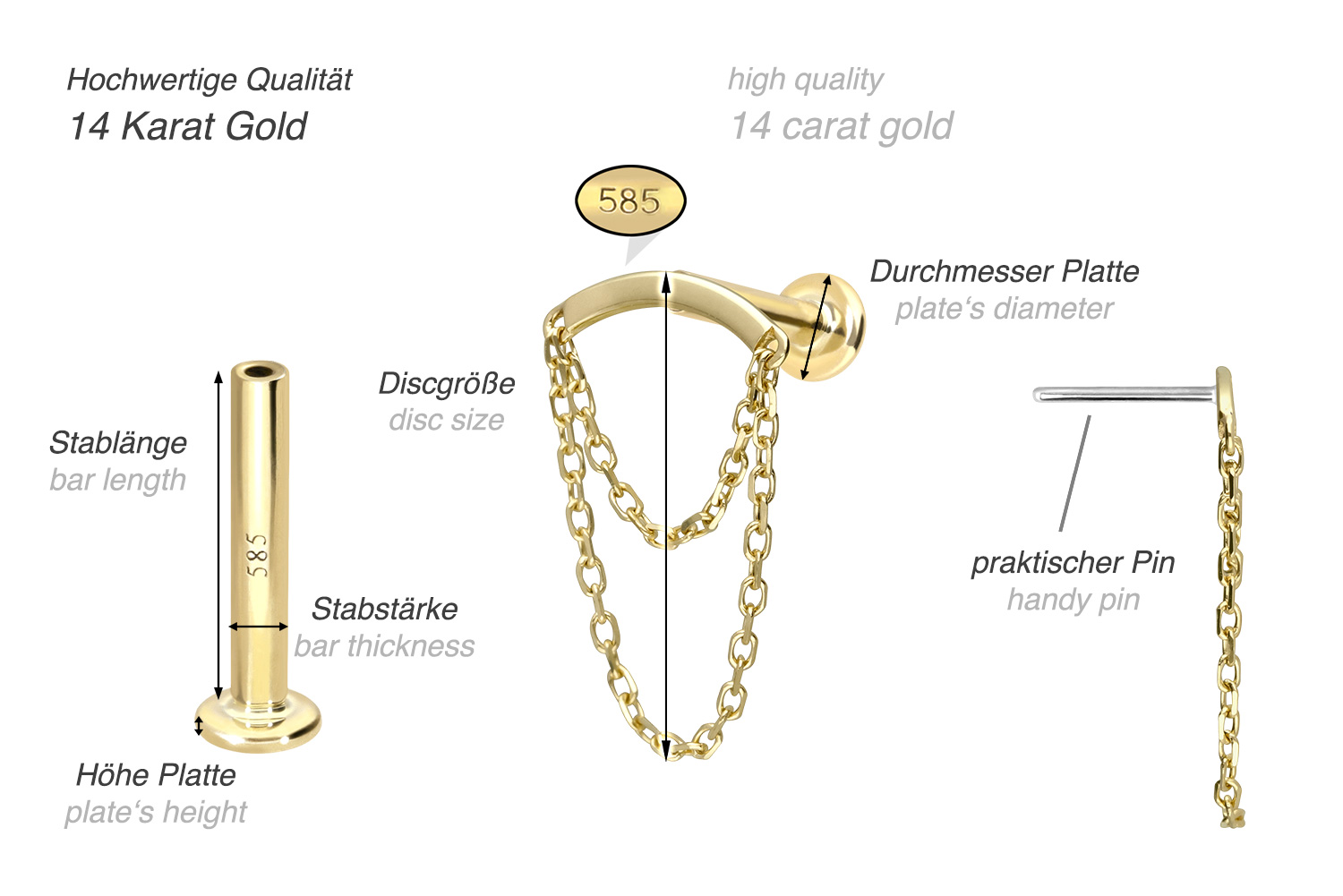 Dieses Labret ist aus hochwertigem 14 Karat (585er) Gold gefertigt, das neben seiner exzellenten Qualität auch mit Eigenschaften wie guter Hautverträglichkeit und hoher Beständigkeit zu begeistern weiß. Farblich ist es in Gelbgold, Roségold und rhodiniertem Weißgold erhältlich. Das Labret verfügt über einen zeitlos schönen Aufsatz mit Titan Push Pin in Form eines Bogens, an welchem zwei Ketten befestigt sind, hat eine Stabstärke von entweder 1 oder 1,2 mm und ist in den unten aufgeführten Stablängen erhältlich. Jeder Einzelne unserer Artikel aus Gold wird mit viel Liebe zum Detail in Handarbeit gefertigt und ist somit ein Unikat. Durch die verwendete Push Fit Technologie kann das Labret nach Belieben mit all unseren Gold Aufsätzen mit Titan Push Pin kombiniert werden.