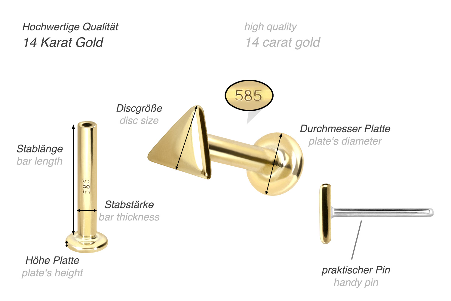 Dieses Labret ist aus hochwertigem 14 Karat (585er) Gold gefertigt, das neben seiner exzellenten Qualität auch mit Eigenschaften wie guter Hautverträglichkeit und hoher Beständigkeit zu begeistern weiß. Farblich ist es in Gelbgold, Roségold und rhodiniertem Weißgold erhältlich. Das Labret verfügt über einen zeitlos schönen Aufsatz mit Titan Push Pin in Form eines Dreiecks, hat eine Stabstärke von entweder 1 oder 1,2 mm und ist in den unten aufgeführten Stablängen erhältlich. Jeder Einzelne unserer Artikel aus Gold wird mit viel Liebe zum Detail in Handarbeit gefertigt und ist somit ein Unikat. Durch die verwendete Push Fit Technologie kann das Labret nach Belieben mit all unseren Gold Aufsätzen mit Titan Push Pin kombiniert werden.