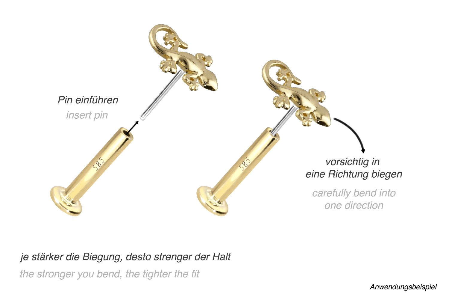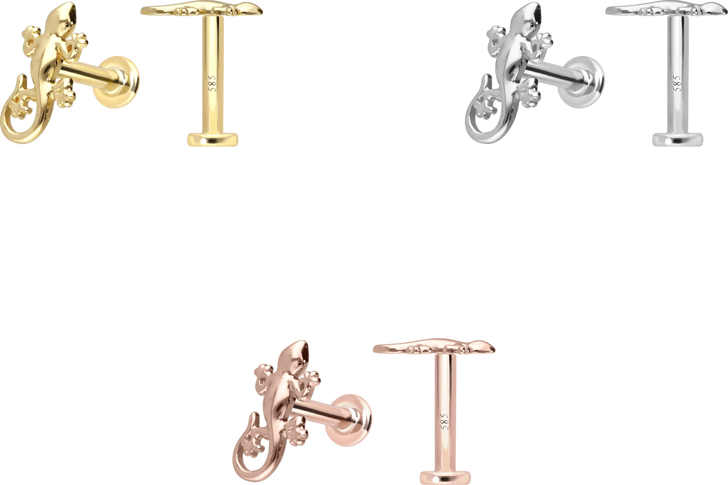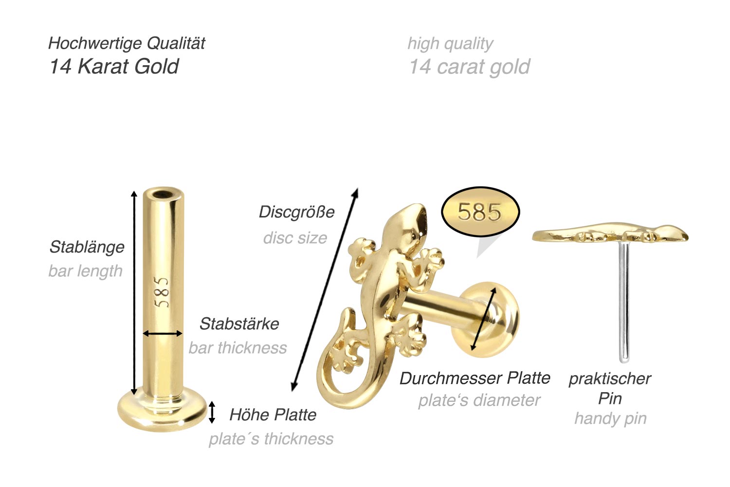 Dieses Labret ist aus hochwertigem 14 Karat (585er) Gold gefertigt, das neben seiner exzellenten Qualität auch mit Eigenschaften wie guter Hautverträglichkeit und hoher Beständigkeit zu begeistern weiß. Farblich ist es in Gelbgold, Roségold und rhodiniertem Weißgold erhältlich. Das Labret verfügt über einen zeitlos schönen Aufsatz mit Titan Push Pin in Form eines Geckos, hat eine Stabstärke von entweder 1 oder 1,2 mm und ist in den unten aufgeführten Stablängen erhältlich. Jeder Einzelne unserer Artikel aus Gold wird mit viel Liebe zum Detail in Handarbeit gefertigt und ist somit ein Unikat. Durch die verwendete Push Fit Technologie kann das Labret nach Belieben mit all unseren Gold Aufsätzen mit Titan Push Pin kombiniert werden.