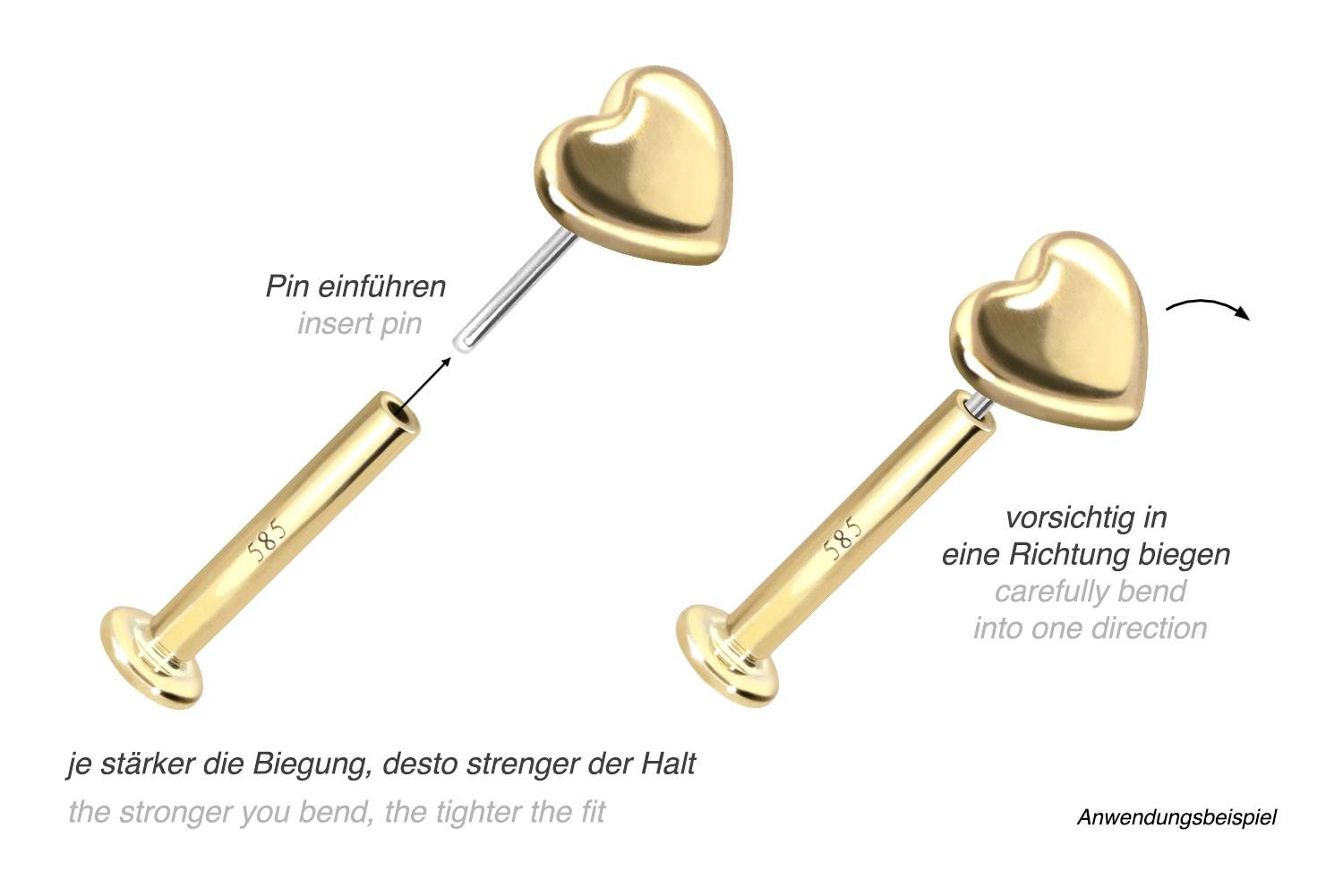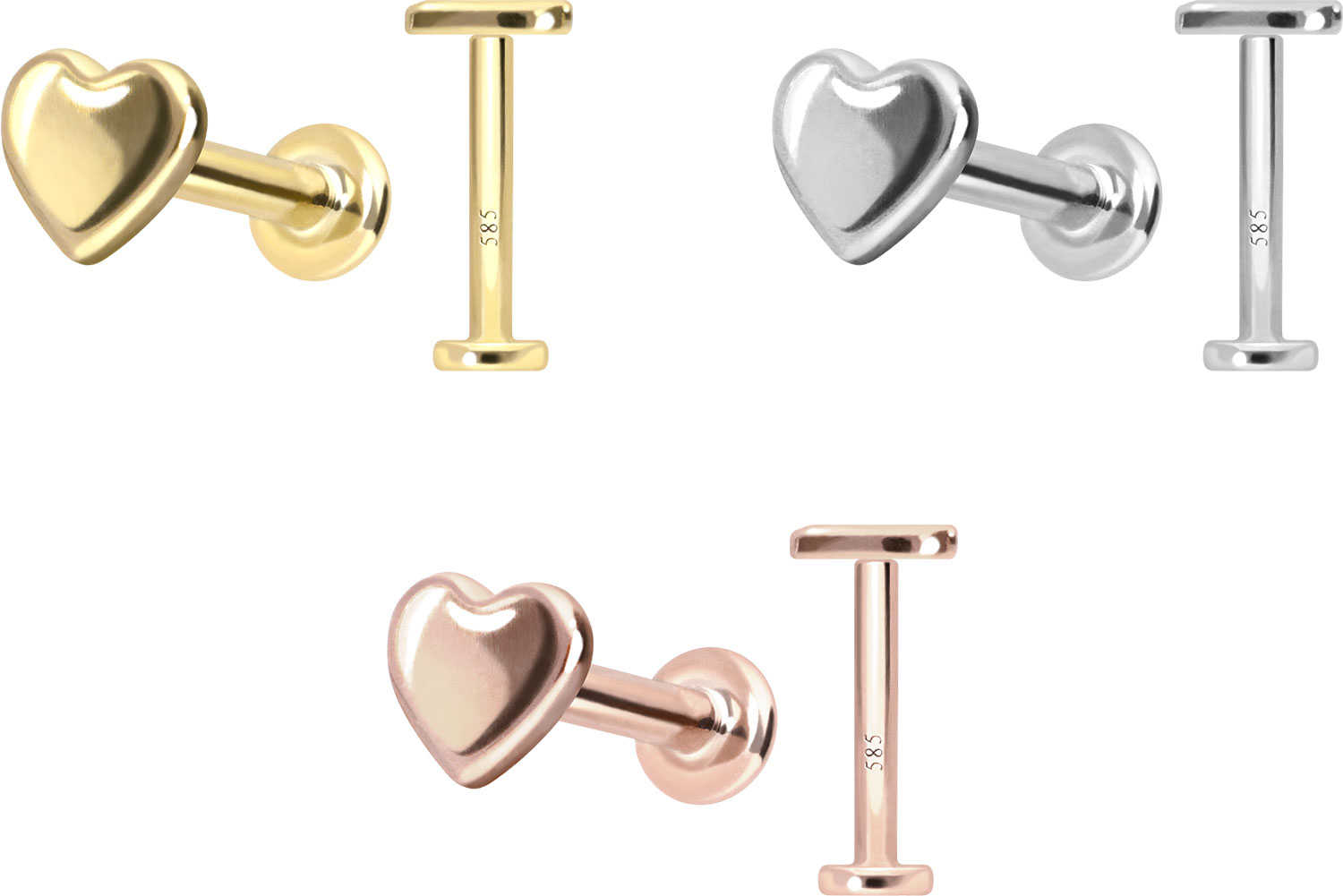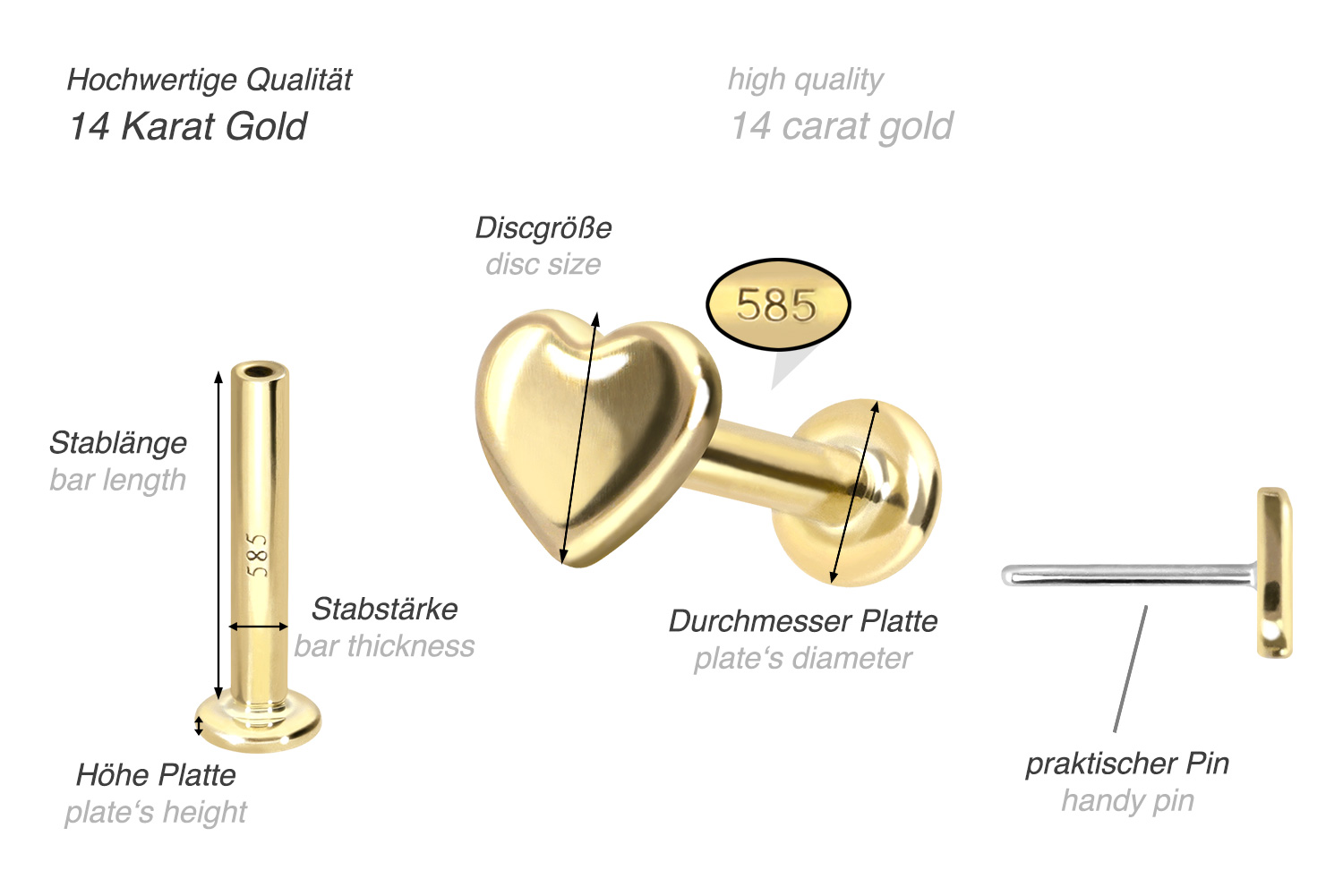Dieses Labret ist aus hochwertigem 14 Karat (585er) Gold gefertigt, das neben seiner exzellenten Qualität auch mit Eigenschaften wie guter Hautverträglichkeit und hoher Beständigkeit zu begeistern weiß. Farblich ist es in Gelbgold, Roségold und rhodiniertem Weißgold erhältlich. Das Labret verfügt über einen zeitlos schönen Aufsatz mit Titan Push Pin in Form eines Herzens, hat eine Stabstärke von entweder 1 oder 1,2 mm und ist in den unten aufgeführten Stablängen erhältlich. Jeder Einzelne unserer Artikel aus Gold wird mit viel Liebe zum Detail in Handarbeit gefertigt und ist somit ein Unikat. Durch die verwendete Push Fit Technologie kann das Labret nach Belieben mit all unseren Gold Aufsätzen mit Titan Push Pin kombiniert werden.