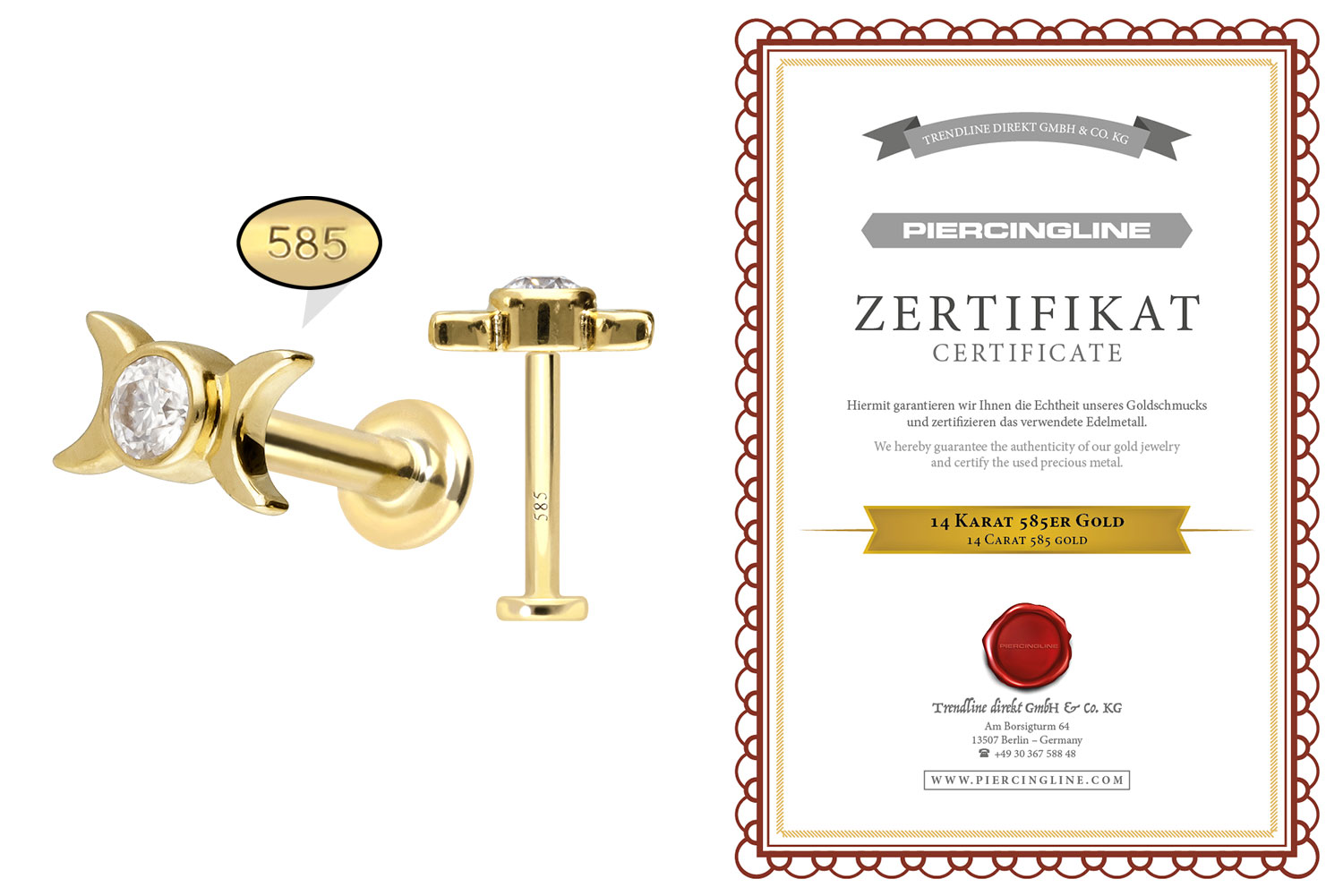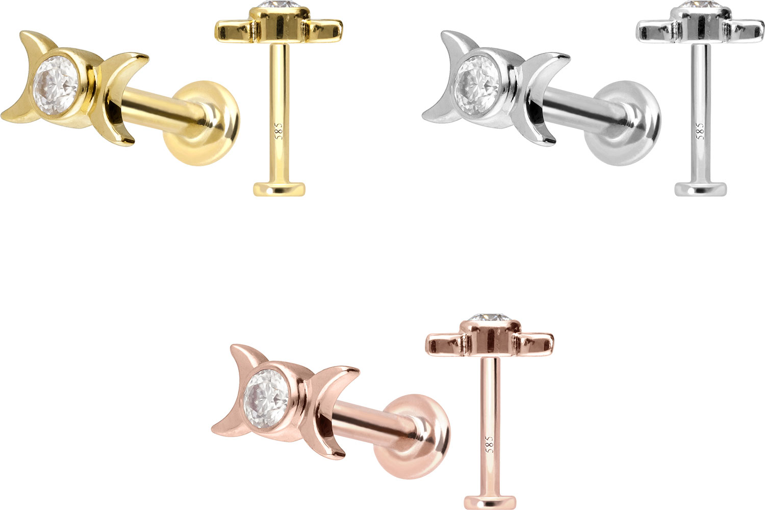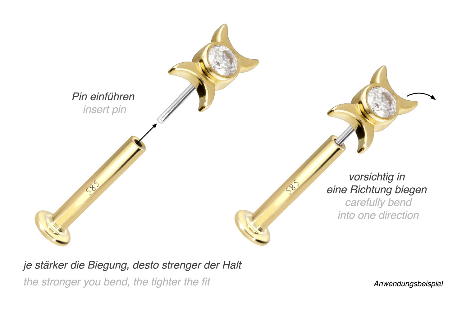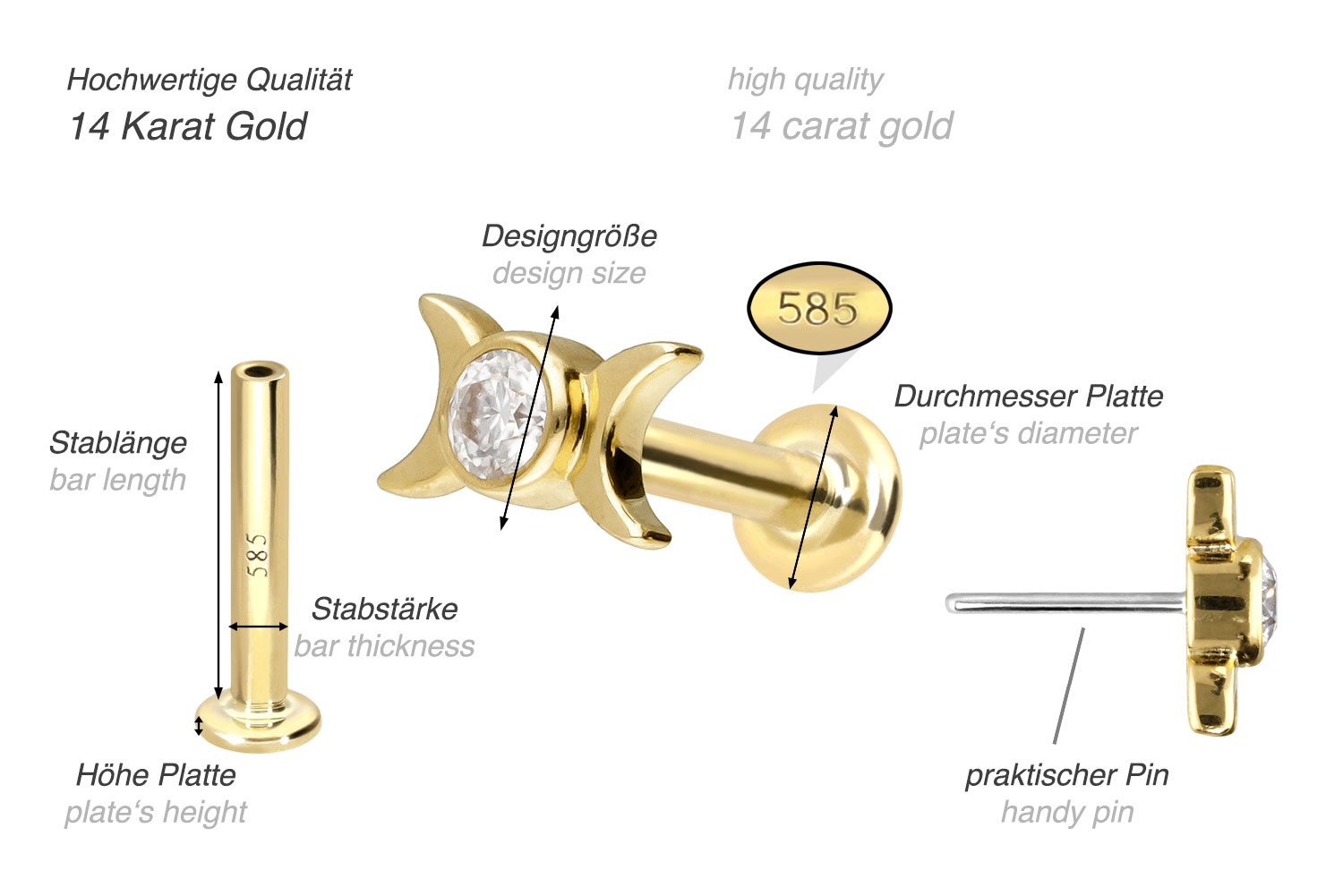 Dieses Labret ist mit Ausnahme der Moissanite aus hochwertigem 14 Karat (585er) Gold gefertigt, das neben seiner exzellenten Qualität auch mit Eigenschaften wie guter Hautverträglichkeit und hoher Beständigkeit zu begeistern weiß. Farblich ist es in Gelbgold, Roségold und rhodiniertem Weißgold erhältlich. Das Labret verfügt über einen zeitlos schönen Aufsatz mit Titan Push Pin in Form eines Moissanits mit 2 Monden, hat eine Stabstärke von entweder 1 oder 1,2 mm und ist in den unten aufgeführten Stablängen erhältlich. Der Moissanit verleiht dem Schmuckstück seinen außergewöhnlichen, diamantenähnlichen Glanz. Jeder Einzelne unserer Artikel aus Gold wird mit viel Liebe zum Detail in Handarbeit gefertigt und ist somit ein Unikat. Durch die verwendete Push Fit Technologie kann das Labret nach Belieben mit all unseren Gold Aufsätzen mit Titan Push Pin kombiniert werden.