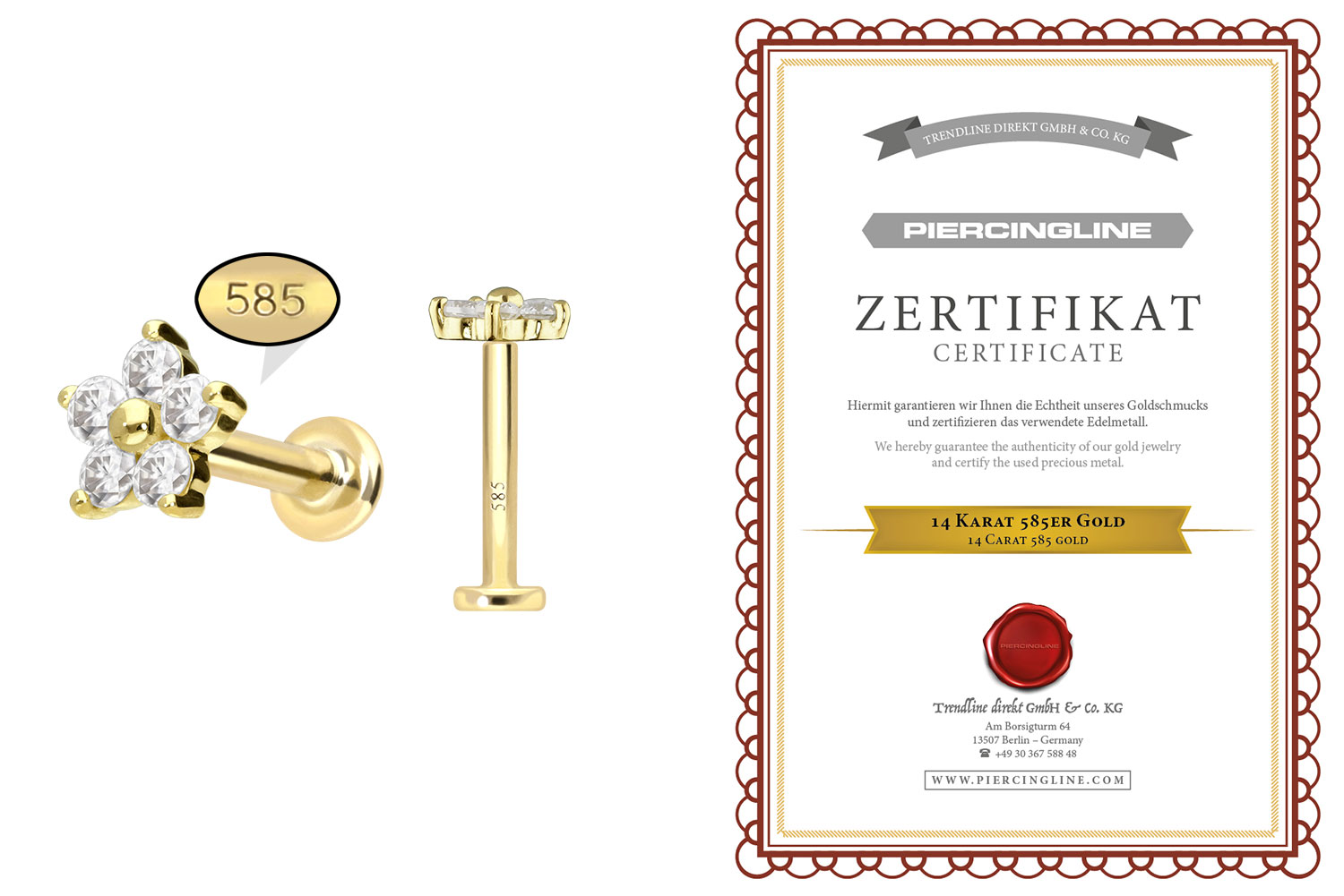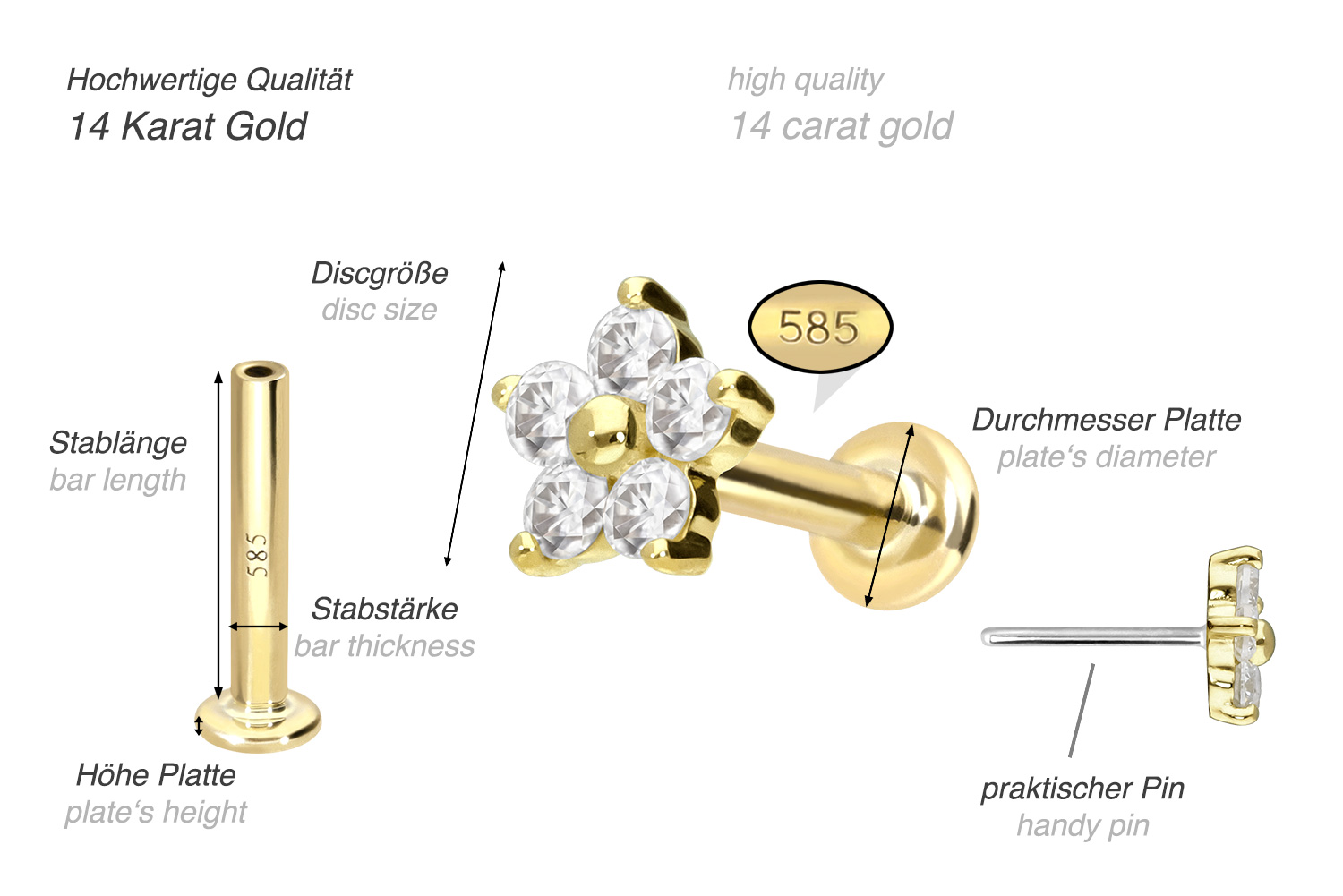 Dieses Labret ist mit Ausnahme der Moissanite aus hochwertigem 14 Karat (585er) Gold gefertigt, das neben seiner exzellenten Qualität auch mit Eigenschaften wie guter Hautverträglichkeit und hoher Beständigkeit zu begeistern weiß. Farblich ist es in Gelbgold, Roségold und rhodiniertem Weißgold erhältlich. Das Labret verfügt über einen zeitlos schönen Aufsatz mit Titan Push Pin in Form einer Blume, hat eine Stabstärke von entweder 1 oder 1,2 mm und ist in den unten aufgeführten Stablängen erhältlich. Der Moissanit verleiht dem Schmuckstück seinen außergewöhnlichen, diamantenähnlichen Glanz. Jeder Einzelne unserer Artikel aus Gold wird mit viel Liebe zum Detail in Handarbeit gefertigt und ist somit ein Unikat. Durch die verwendete Push Fit Technologie kann das Labret nach Belieben mit all unseren Gold Aufsätzen mit Titan Push Pin kombiniert werden.