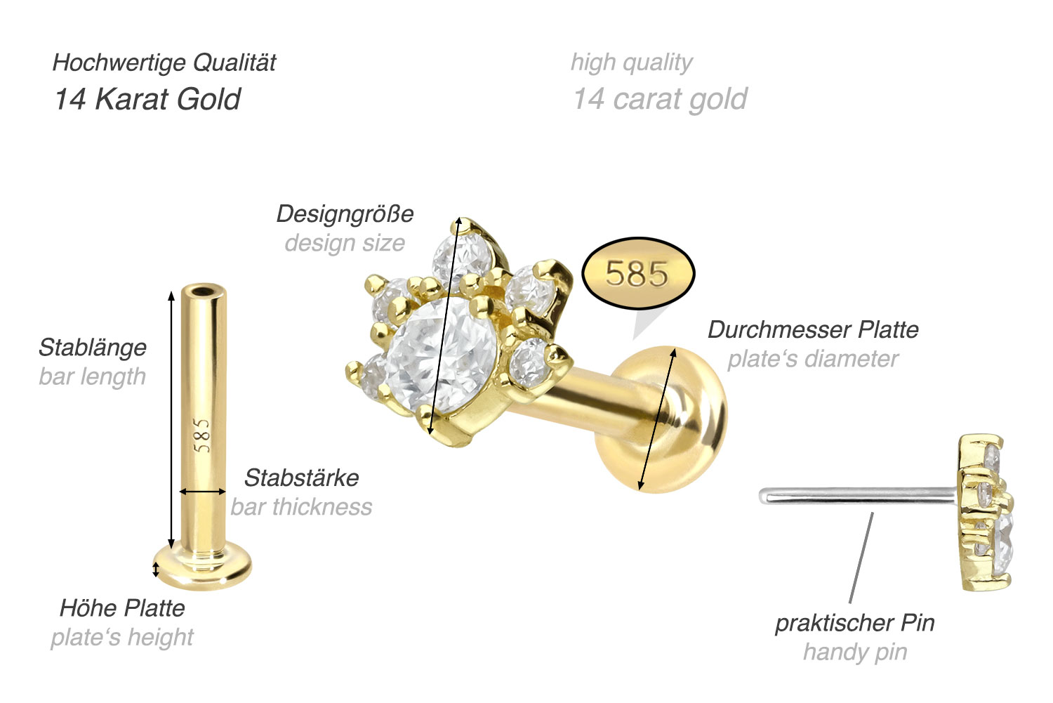 Dieses Labret ist mit Ausnahme der Moissanite aus hochwertigem 14 Karat (585er) Gold gefertigt, das neben seiner exzellenten Qualität auch mit Eigenschaften wie guter Hautverträglichkeit und hoher Beständigkeit zu begeistern weiß. Farblich ist es in Gelbgold, Roségold und rhodiniertem Weißgold erhältlich. Das Labret verfügt über einen zeitlos schönen Aufsatz mit Titan Push Pin in Form einer Blume, hat eine Stabstärke von entweder 1 oder 1,2 mm und ist in den unten aufgeführten Stablängen erhältlich. Der Moissanit verleiht dem Schmuckstück seinen außergewöhnlichen, diamantenähnlichen Glanz. Jeder Einzelne unserer Artikel aus Gold wird mit viel Liebe zum Detail in Handarbeit gefertigt und ist somit ein Unikat. Durch die verwendete Push Fit Technologie kann das Labret nach Belieben mit all unseren Gold Aufsätzen mit Titan Push Pin kombiniert werden.