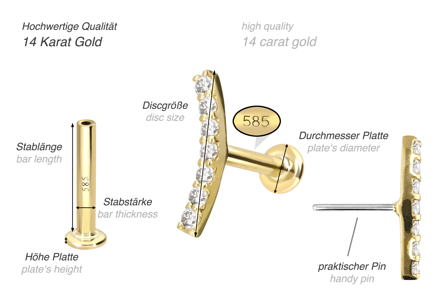 Dieses Labret ist mit Ausnahme der Moissanite aus hochwertigem 14 Karat (585er) Gold gefertigt, das neben seiner exzellenten Qualität auch mit Eigenschaften wie guter Hautverträglichkeit und hoher Beständigkeit zu begeistern weiß. Farblich ist es in Gelbgold, Roségold und rhodiniertem Weißgold erhältlich. Das Labret verfügt über einen zeitlos schönen Aufsatz mit Titan Push Pin in Form eines Bogens, hat eine Stabstärke von entweder 1 oder 1,2 mm und ist in den unten aufgeführten Stablängen erhältlich. Der Moissanit verleiht dem Schmuckstück seinen außergewöhnlichen, diamantenähnlichen Glanz. Jeder Einzelne unserer Artikel aus Gold wird mit viel Liebe zum Detail in Handarbeit gefertigt und ist somit ein Unikat. Durch die verwendete Push Fit Technologie kann das Labret nach Belieben mit all unseren Gold Aufsätzen mit Titan Push Pin kombiniert werden.