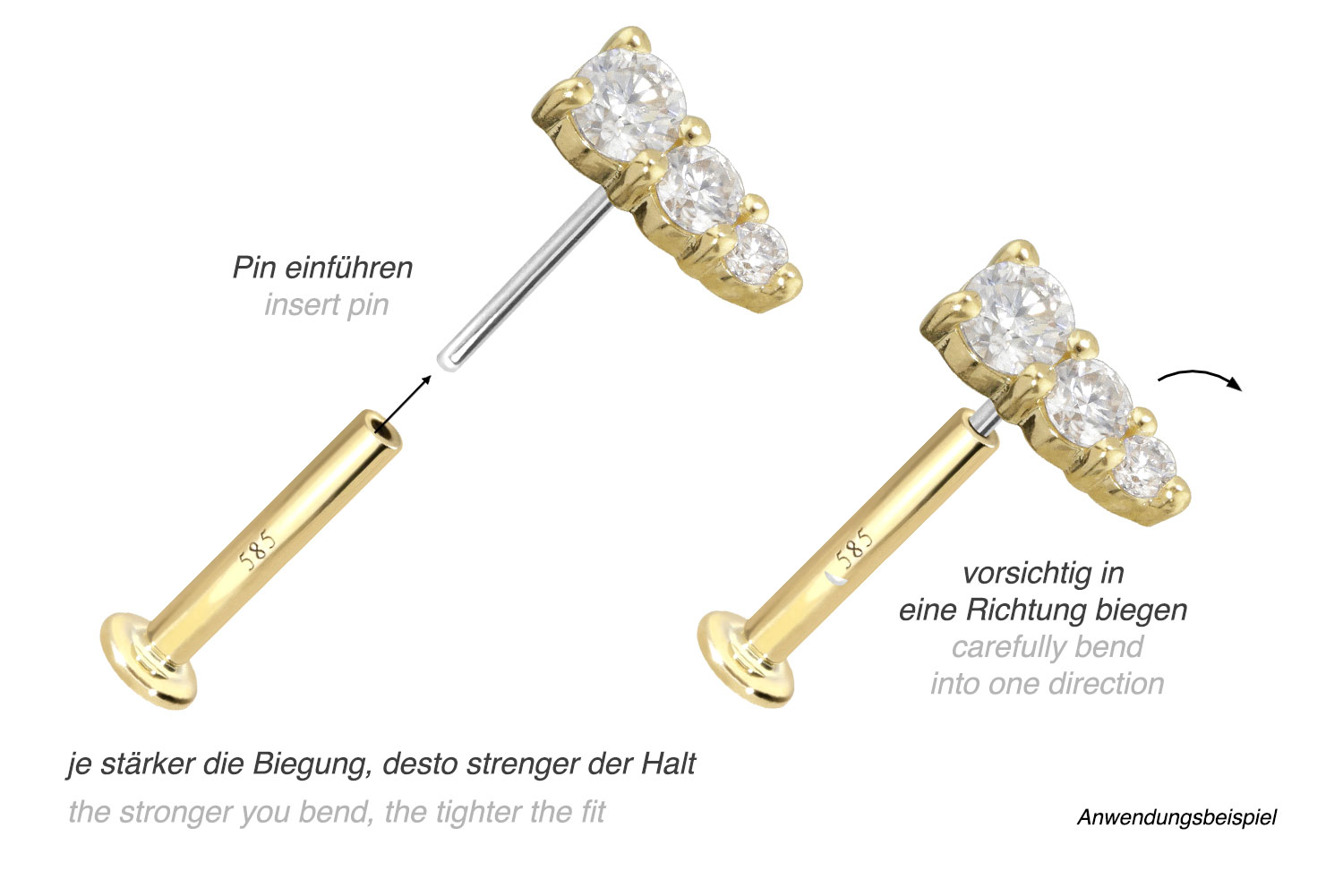 Dieses Labret ist mit Ausnahme der Moissanite aus hochwertigem 14 Karat (585er) Gold gefertigt, das neben seiner exzellenten Qualität auch mit Eigenschaften wie guter Hautverträglichkeit und hoher Beständigkeit zu begeistern weiß. Farblich ist es in Gelbgold, Roségold und rhodiniertem Weißgold erhältlich. Das Labret verfügt über einen zeitlos schönen Aufsatz mit Titan Push Pin in Form eines Eiszapfens, hat eine Stabstärke von entweder 1 oder 1,2 mm und ist in den unten aufgeführten Stablängen erhältlich. Der Moissanit verleiht dem Schmuckstück seinen außergewöhnlichen, diamantenähnlichen Glanz. Jeder Einzelne unserer Artikel aus Gold wird mit viel Liebe zum Detail in Handarbeit gefertigt und ist somit ein Unikat. Durch die verwendete Push Fit Technologie kann das Labret nach Belieben mit all unseren Gold Aufsätzen mit Titan Push Pin kombiniert werden.
