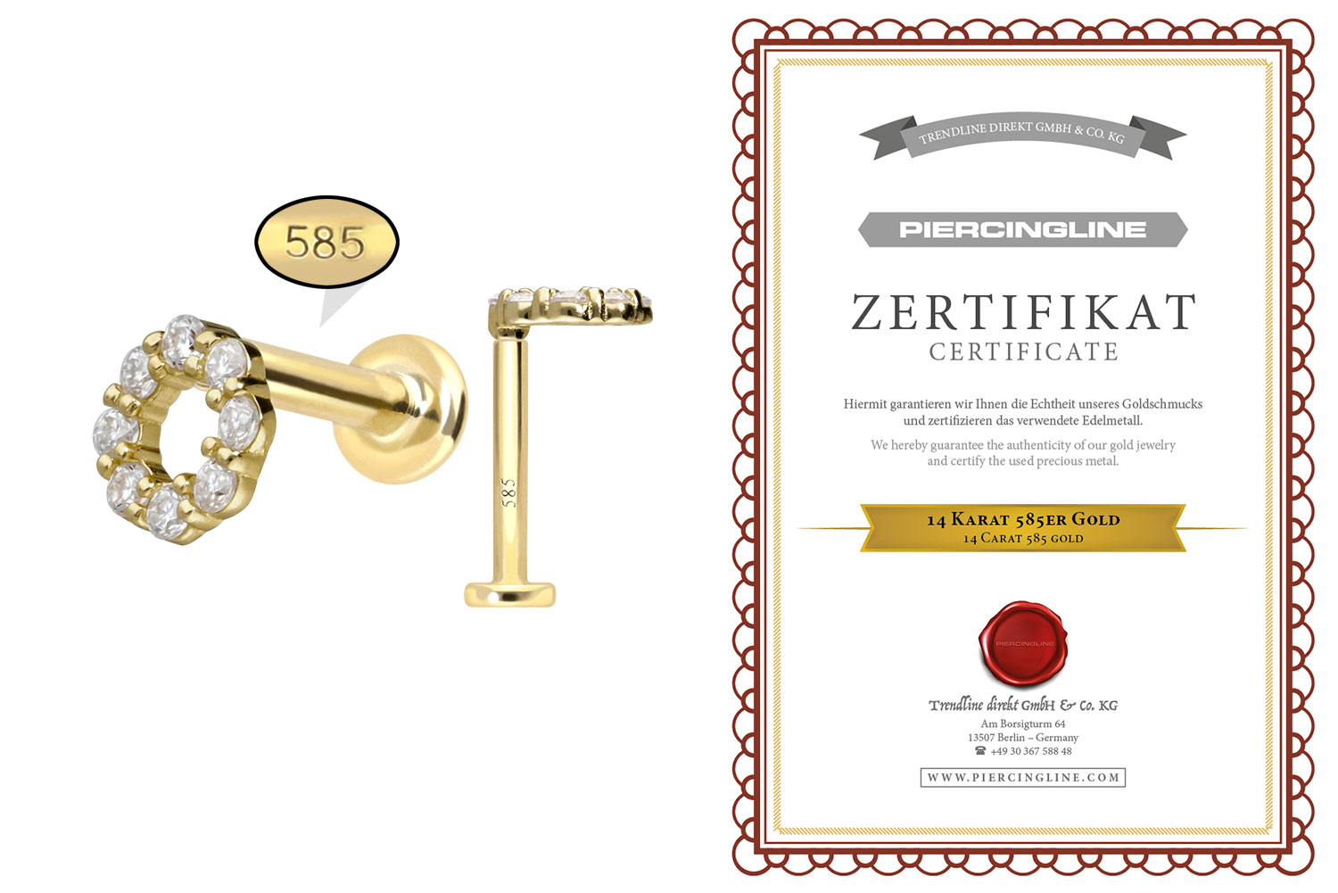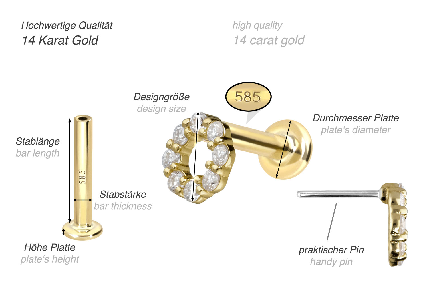 Dieses Labret ist mit Ausnahme der Moissanite aus hochwertigem 14 Karat (585er) Gold gefertigt, das neben seiner exzellenten Qualität auch mit Eigenschaften wie guter Hautverträglichkeit und hoher Beständigkeit zu begeistern weiß. Farblich ist es in Gelbgold, Roségold und rhodiniertem Weißgold erhältlich. Das Labret verfügt über einen zeitlos schönen Aufsatz mit Titan Push Pin in Form eines Kreises, hat eine Stabstärke von entweder 1 oder 1,2 mm und ist in den unten aufgeführten Stablängen erhältlich. Der Moissanit verleiht dem Schmuckstück seinen außergewöhnlichen, diamantenähnlichen Glanz. Jeder Einzelne unserer Artikel aus Gold wird mit viel Liebe zum Detail in Handarbeit gefertigt und ist somit ein Unikat. Durch die verwendete Push Fit Technologie kann das Labret nach Belieben mit all unseren Gold Aufsätzen mit Titan Push Pin kombiniert werden.