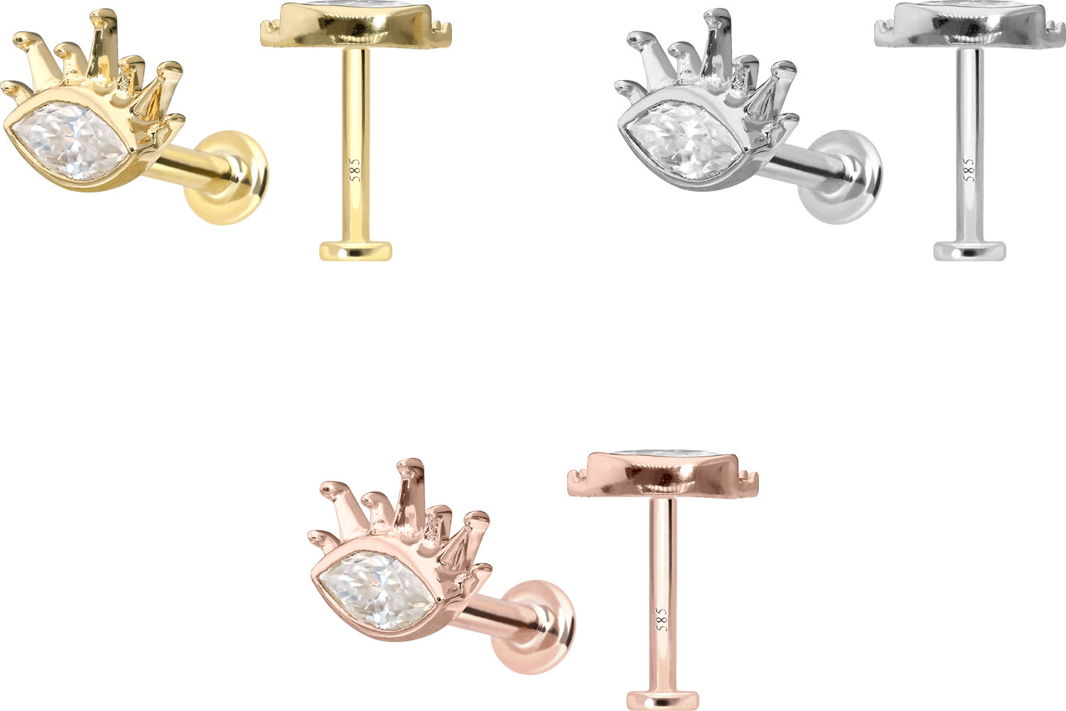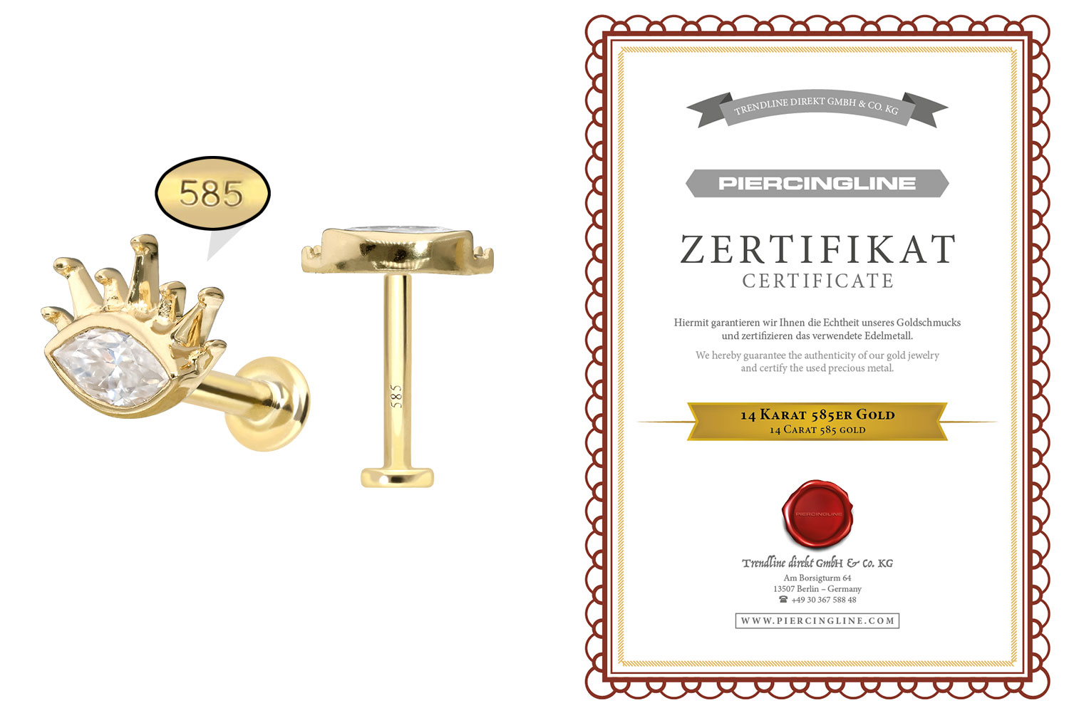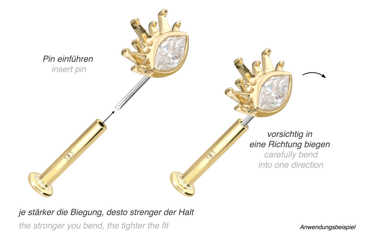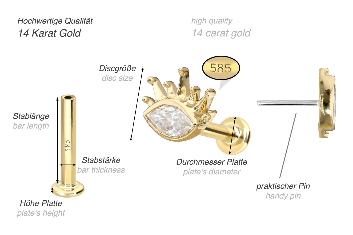 Dieses Labret ist mit Ausnahme des Moissanits aus hochwertigem 14 Karat (585er) Gold gefertigt, das neben seiner exzellenten Qualität auch mit Eigenschaften wie guter Hautverträglichkeit und hoher Beständigkeit zu begeistern weiß. Farblich ist es in Gelbgold, Roségold und rhodiniertem Weißgold erhältlich. Das Labret verfügt über einen zeitlos schönen Aufsatz mit Titan Push Pin in Form eines Ovals, welches von Sonnenstrahlen umgeben ist, hat eine Stabstärke von entweder 1 oder 1,2 mm und ist in den unten aufgeführten Stablängen erhältlich. Der Moissanit verleiht dem Schmuckstück seinen außergewöhnlichen, diamantenähnlichen Glanz. Jeder Einzelne unserer Artikel aus Gold wird mit viel Liebe zum Detail in Handarbeit gefertigt und ist somit ein Unikat. Durch die verwendete Push Fit Technologie kann das Labret nach Belieben mit all unseren Gold Aufsätzen mit Titan Push Pin kombiniert werden.