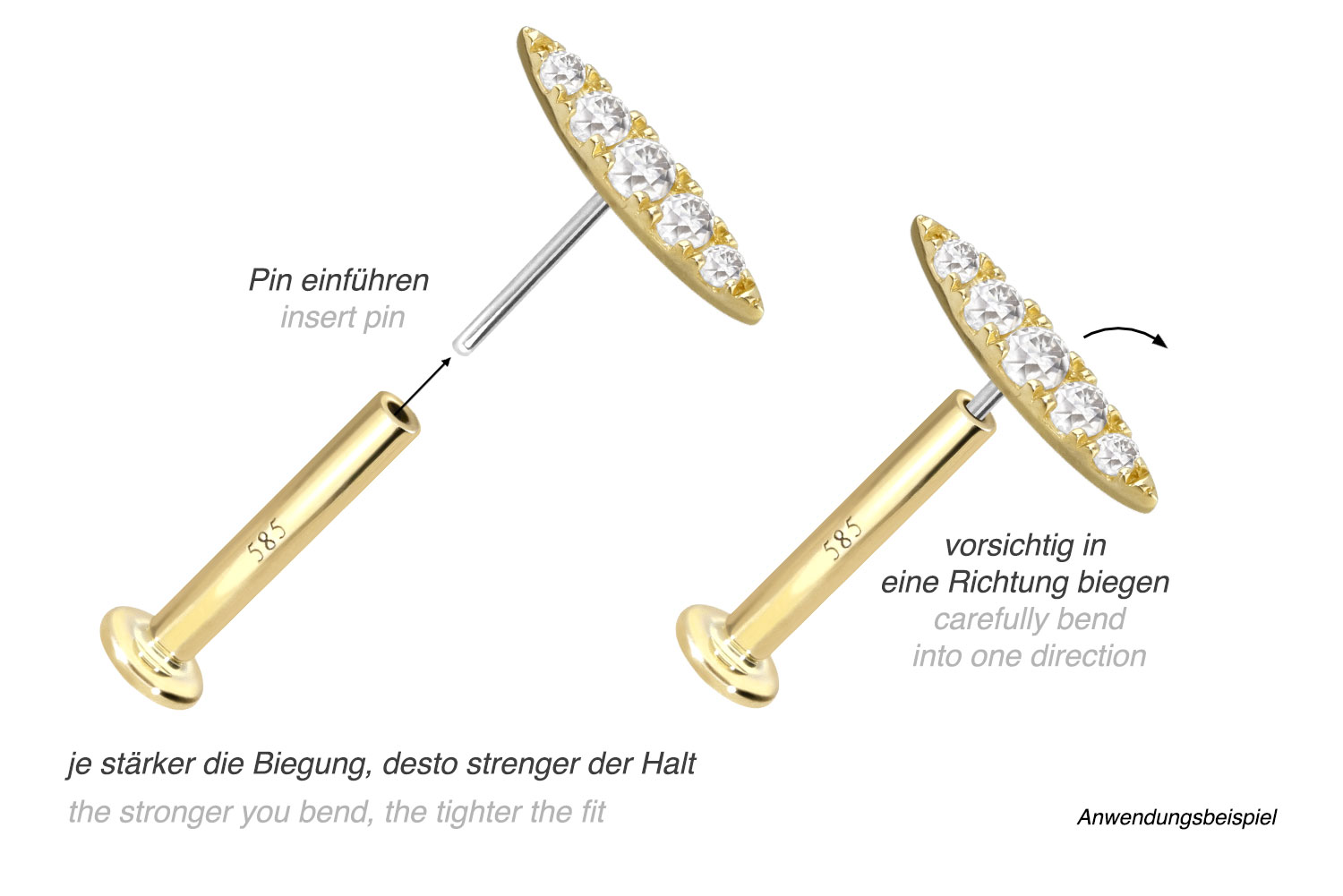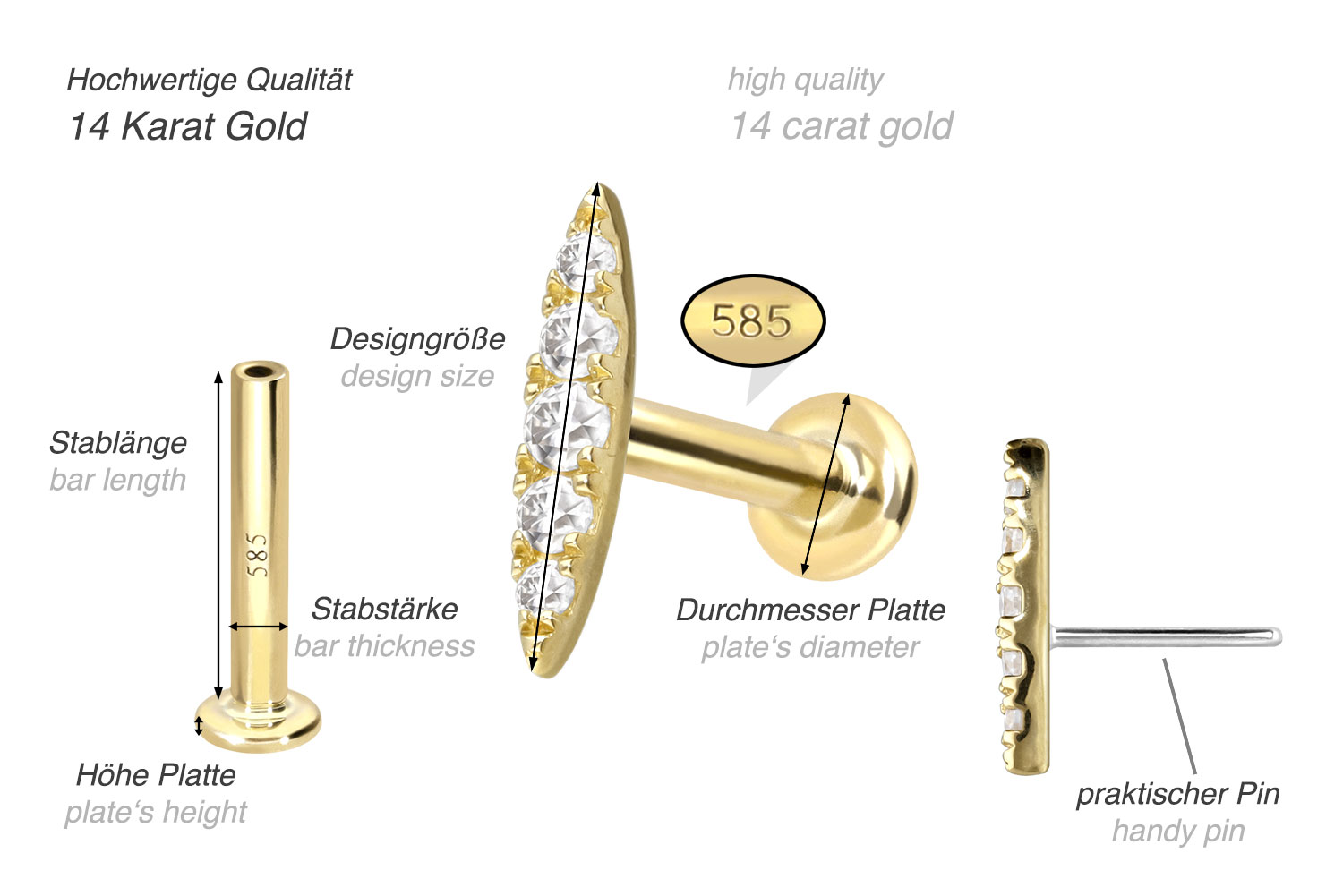 Dieses Labret ist mit Ausnahme der Moissanite aus hochwertigem 14 Karat (585er) Gold gefertigt, das neben seiner exzellenten Qualität auch mit Eigenschaften wie guter Hautverträglichkeit und hoher Beständigkeit zu begeistern weiß. Farblich ist es in Gelbgold, Roségold und rhodiniertem Weißgold erhältlich. Das Labret verfügt über einen zeitlos schönen Aufsatz mit Titan Push Pin in Form eines Ovals, hat eine Stabstärke von entweder 1 oder 1,2 mm und ist in den unten aufgeführten Stablängen erhältlich. Der Moissanit verleiht dem Schmuckstück seinen außergewöhnlichen, diamantenähnlichen Glanz. Jeder Einzelne unserer Artikel aus Gold wird mit viel Liebe zum Detail in Handarbeit gefertigt und ist somit ein Unikat. Durch die verwendete Push Fit Technologie kann das Labret nach Belieben mit all unseren Gold Aufsätzen mit Titan Push Pin kombiniert werden.