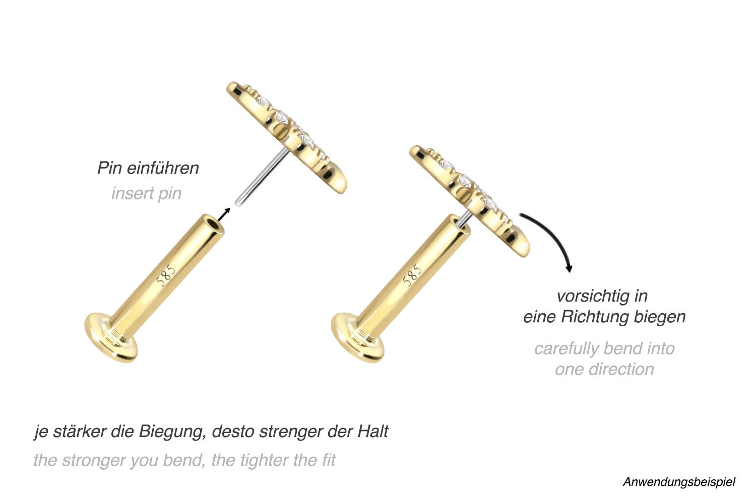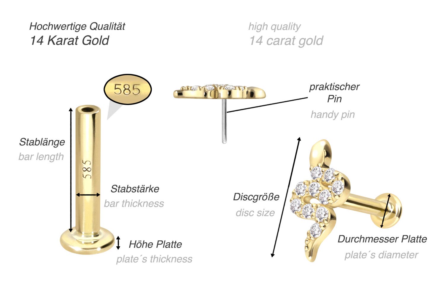 Dieses Labret ist mit Ausnahme der Moissanite aus hochwertigem 14 Karat (585er) Gold gefertigt, das neben seiner exzellenten Qualität auch mit Eigenschaften wie guter Hautverträglichkeit und hoher Beständigkeit zu begeistern weiß. Farblich ist es in Gelbgold, Roségold und rhodiniertem Weißgold erhältlich. Das Labret verfügt über einen zeitlos schönen Aufsatz mit Titan Push Pin in Form einer Schlange, hat eine Stabstärke von entweder 1 oder 1,2 mm und ist in den unten aufgeführten Stablängen erhältlich. Der Moissanit verleiht dem Schmuckstück seinen außergewöhnlichen, diamantenähnlichen Glanz. Jeder Einzelne unserer Artikel aus Gold wird mit viel Liebe zum Detail in Handarbeit gefertigt und ist somit ein Unikat. Durch die verwendete Push Fit Technologie kann das Labret nach Belieben mit all unseren Gold Aufsätzen mit Titan Push Pin kombiniert werden.