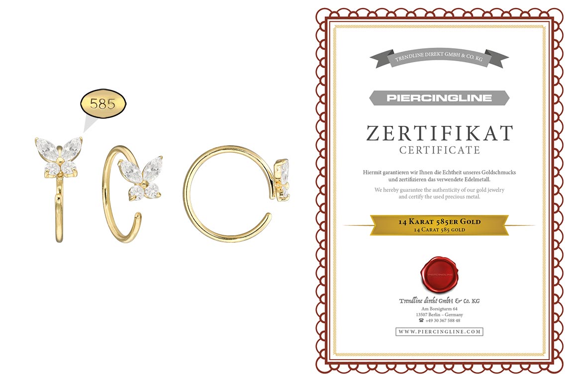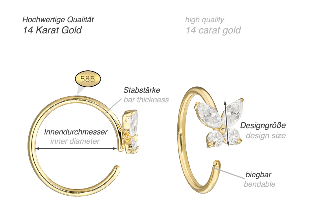 Dieser Nasenring mit dem Design in Form eines Schmetterlings besteht mit Ausnahme der Moissanite vollständig aus hochwertigem 14 Karat (585er) Gelbgold, das neben seiner exzellenten Qualität auch mit Eigenschaften wie guter Hautverträglichkeit und hoher Beständigkeit zu begeistern weiß.Der Moissanit verleiht dem Schmuckstück seinen außergewöhnlichen, diamantenähnlichen Glanz. Jeder Einzelne unserer Artikel aus Gold wird mit viel Liebe zum Detail in Handarbeit gefertigt und ist somit ein Unikat. Da das Schmuckstück zudem biegbar ist, lässt sich eine ideale Anpassung an die individuelle Nasenform vornehmen, sodass sich das Tragegefühl als noch komfortabler erweist. Der Nasenring verfügt stets über eine Stabstärke von 0,8 mm, wohingegen der Innendurchmesser 7mm beträgt.