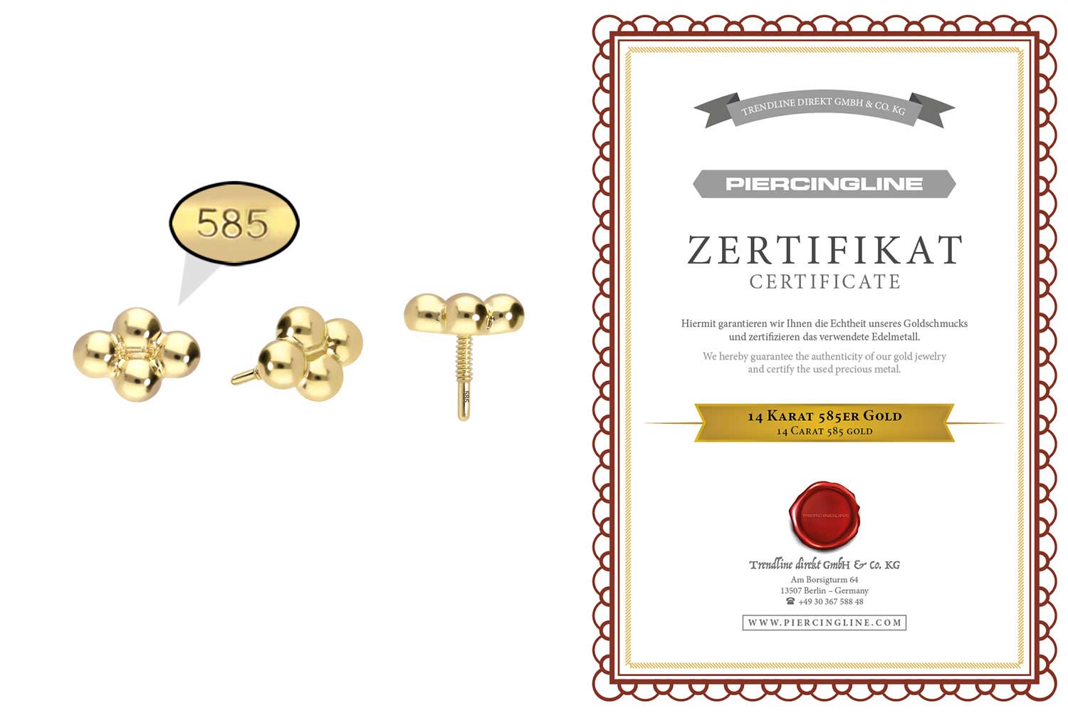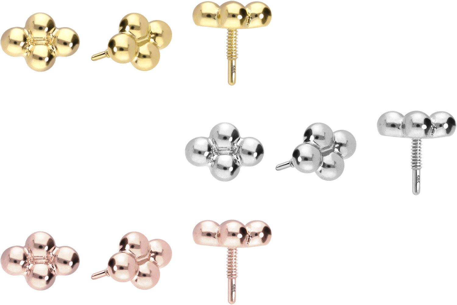 Dieser zeitlos schöne Schraubaufsatz in Form von vier Kugeln besteht aus hochwertigem 14 Karat (585er) Gold, das neben seiner exzellenten Qualität auch mit Eigenschaften wie guter Hautverträglichkeit und hoher Beständigkeit zu begeistern weiß. Farblich ist er in Gelbgold, Roségold und rhodiniertem Weißgold erhältlich. Jeder Einzelne unserer Artikel aus 14-karätigem Gold wird mit viel Liebe zum Detail in Handarbeit gefertigt und ist somit ein Unikat. Das 0,8 mm starke Außengewinde des Aufsatzes ist mit all unseren 14 Karat (585er) Gold Produkten, die über ein solches Innengewinde verfügen, kompatibel, sodass sich vielfältige Kombinationsmöglichkeiten ergeben.