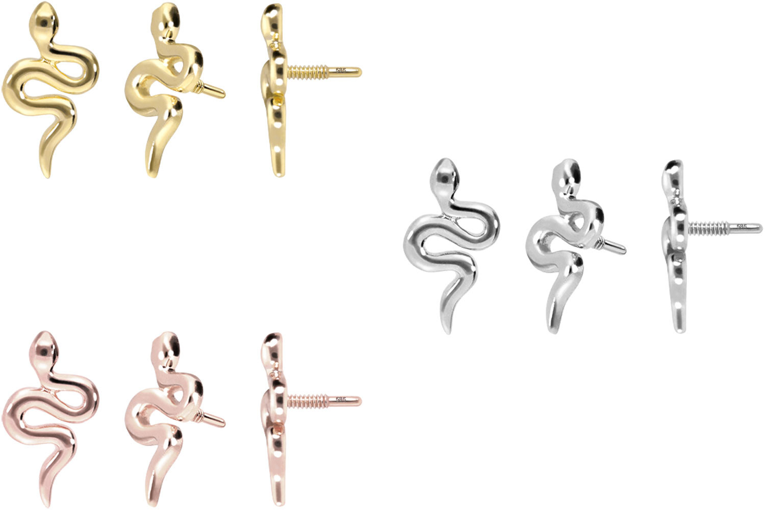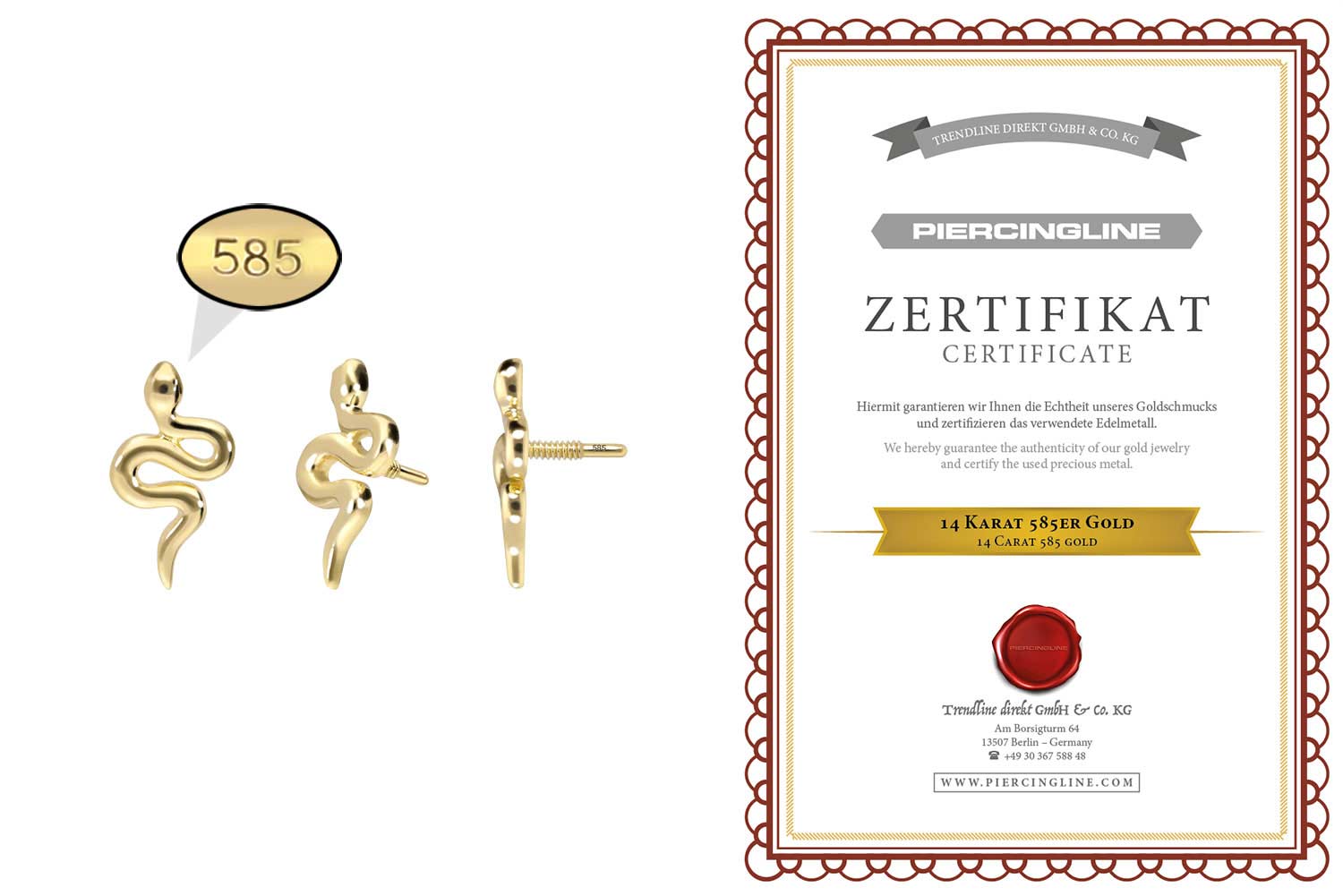 Dieser zeitlos schöne Schraubaufsatz in Form einer schlange besteht vollständig aus hochwertigem 14 Karat (585er) Gold, das neben seiner exzellenten Qualität auch mit Eigenschaften wie guter Hautverträglichkeit und hoher Beständigkeit zu begeistern weiß. Farblich ist er in Gelbgold, Roségold und rhodiniertem Weißgold erhältlich. Jeder Einzelne unserer Artikel aus 14-karätigem Gold wird mit viel Liebe zum Detail in Handarbeit gefertigt und ist somit ein Unikat. Das 0,8 mm starke Außengewinde des Aufsatzes ist mit all unseren 14 Karat (585er) Gold Produkten, die über ein solches Innengewinde verfügen, kompatibel, sodass sich vielfältige Kombinationsmöglichkeiten ergeben.