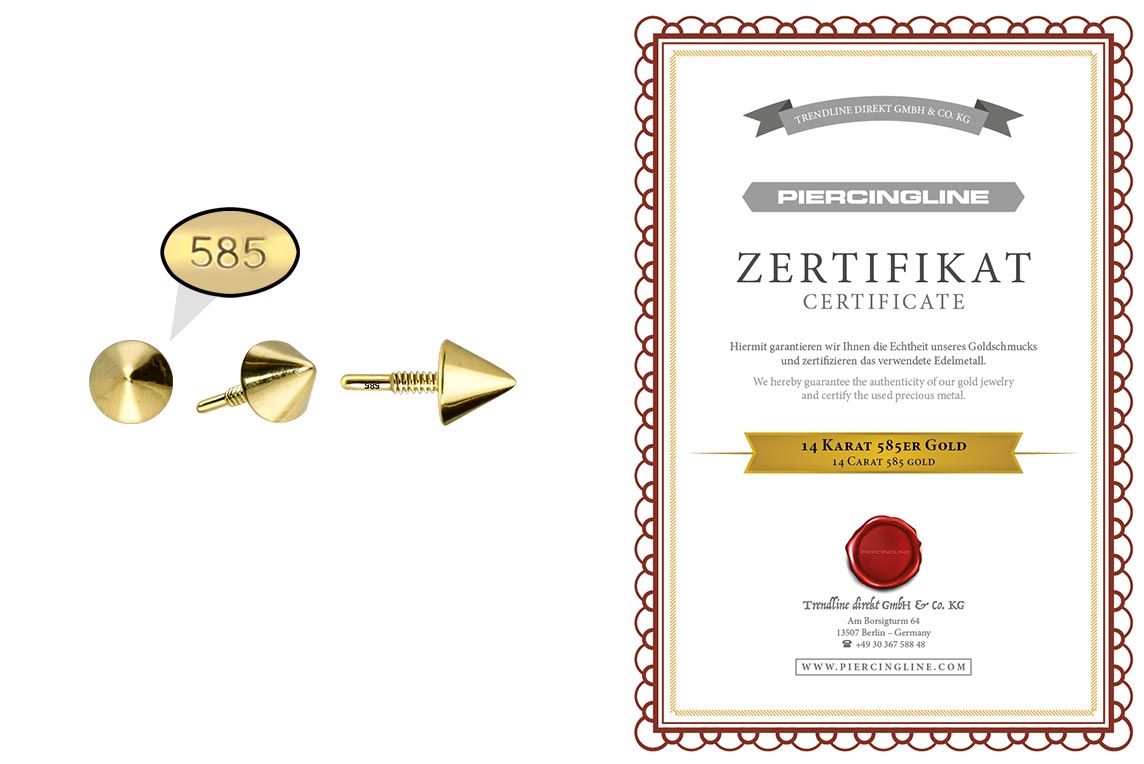 Dieser zeitlos schöne Schraubaufsatz in Form einer Spitze besteht vollständig aus hochwertigem 14 Karat (585er) Gold, das neben seiner exzellenten Qualität auch mit Eigenschaften wie guter Hautverträglichkeit und hoher Beständigkeit zu begeistern weiß. Farblich ist er in Gelbgold, Roségold und rhodiniertem Weißgold erhältlich. Jeder Einzelne unserer Artikel aus 14-karätigem Gold wird mit viel Liebe zum Detail in Handarbeit gefertigt und ist somit ein Unikat. Das 0,8 mm starke Außengewinde des Aufsatzes ist mit all unseren 14 Karat (585er) Gold Produkten, die über ein solches Innengewinde verfügen, kompatibel, sodass sich vielfältige Kombinationsmöglichkeiten ergeben.