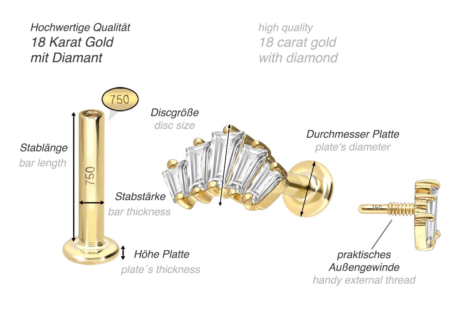 unten aufgeführten Stablängen erhältlich. Der Diamant verleiht dem Schmuckstück seinen außergewöhnlichen Glanz. Jeder Einzelne unserer Artikel aus Gold wird mit viel Liebe zum Detail in Handarbeit gefertigt und ist somit ein Unikat. Das 0,8 mm starke Innengewinde des Labrets ist mit allen Gold Produkten, die über ein solches Außengewinde verfügen, kompatibel, sodass sich vielfältige Kombinationsmöglichkeiten ergeben. Zusätzlich ist im Lieferumfang ein Echtheitszertifikat für den Diamanten enthalten.