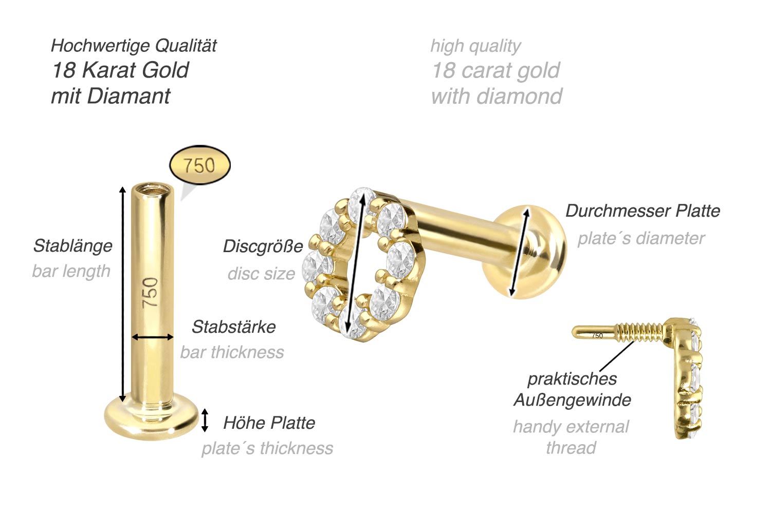 18 Karat Gold Labret mit Innengewinde DIAMANT-KREIS